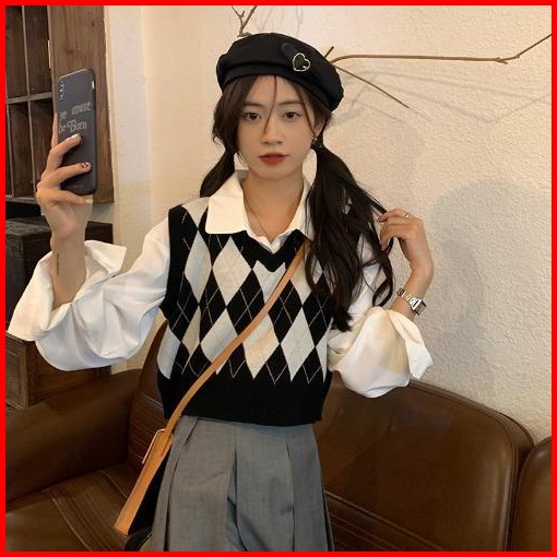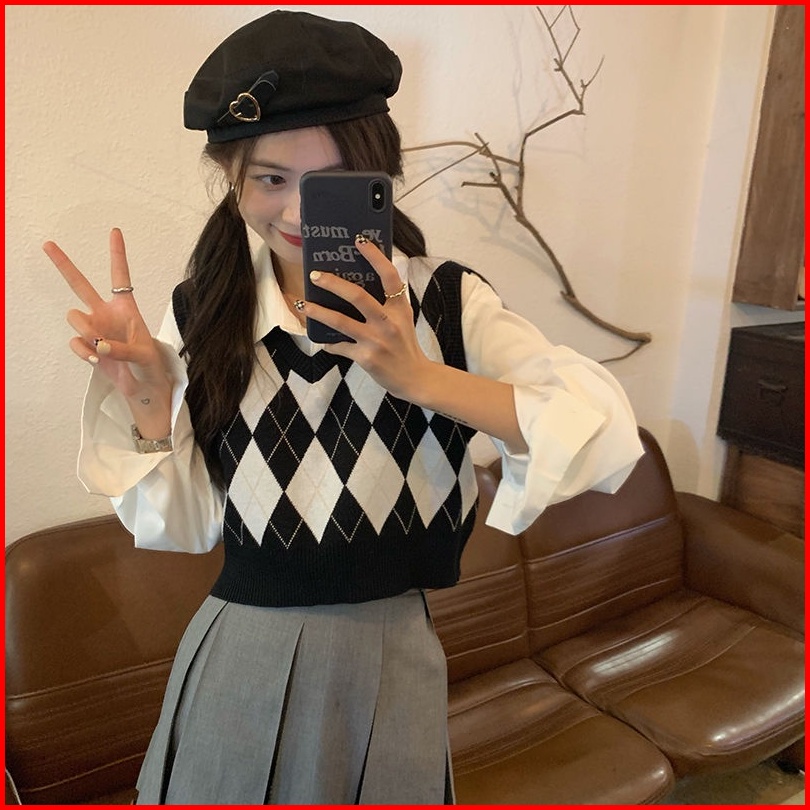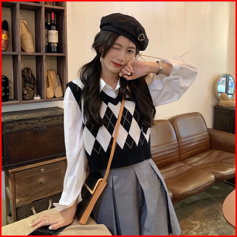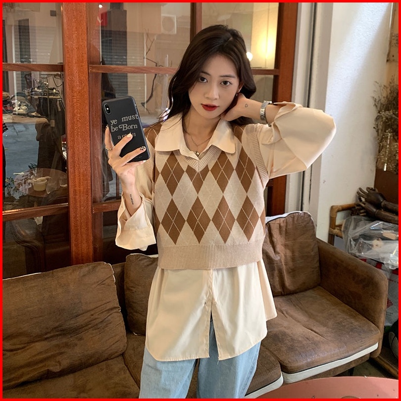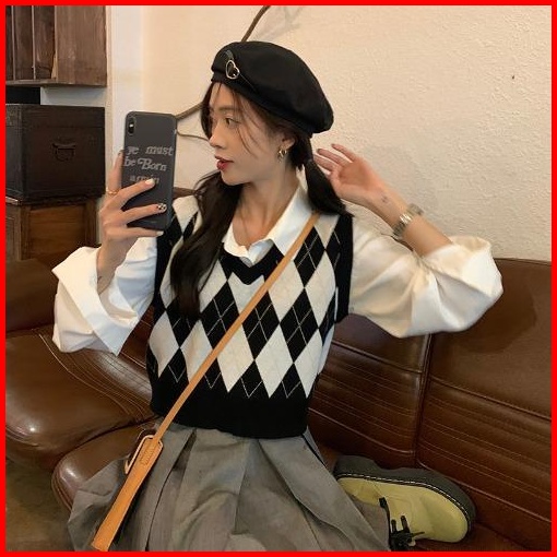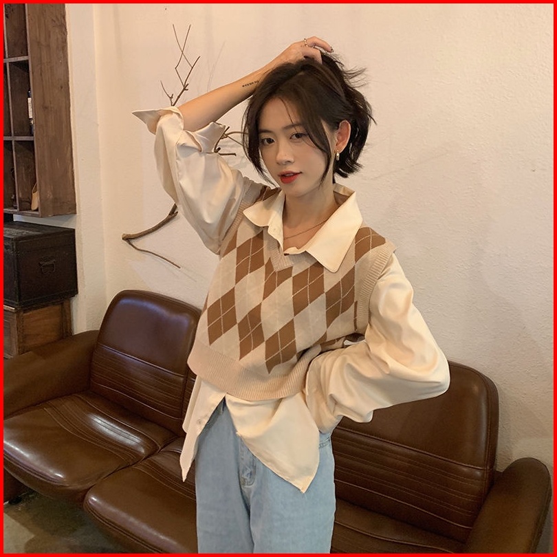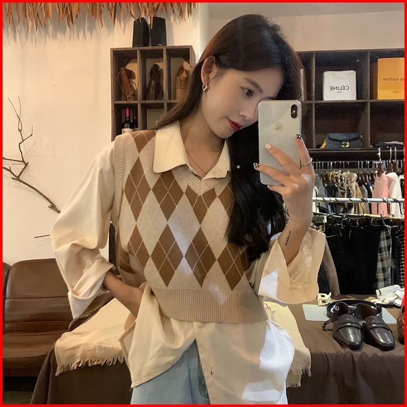 Pakaian Luar Kasual Rompi Kotak-kotak Leher V Rajutan Korea
