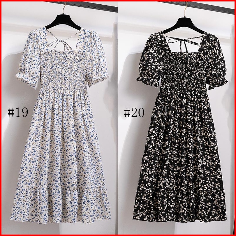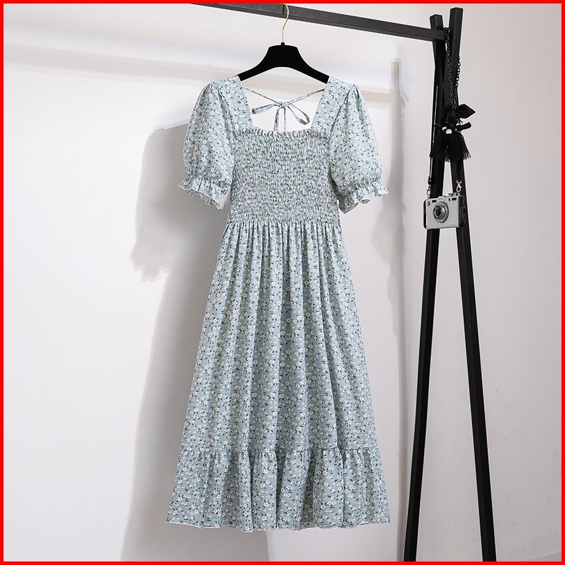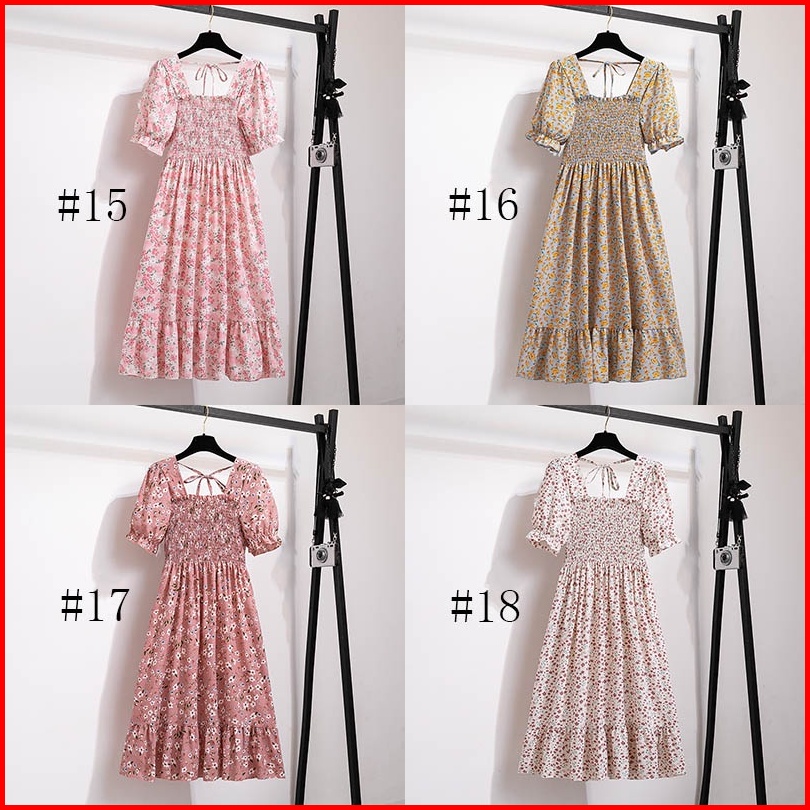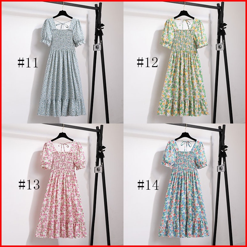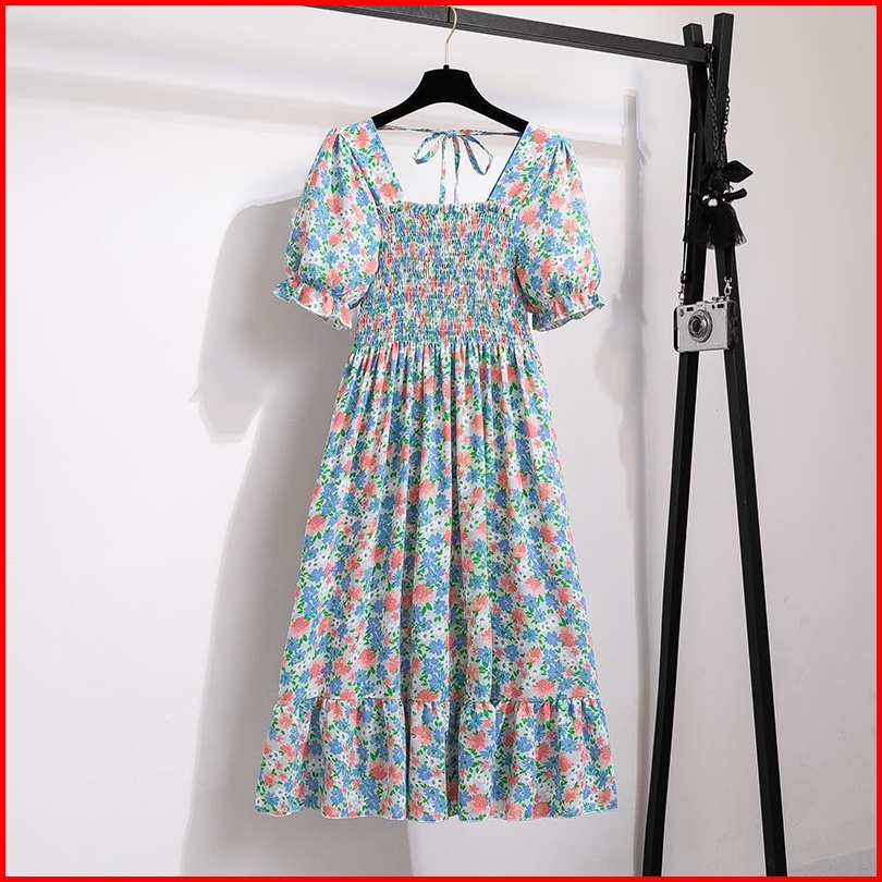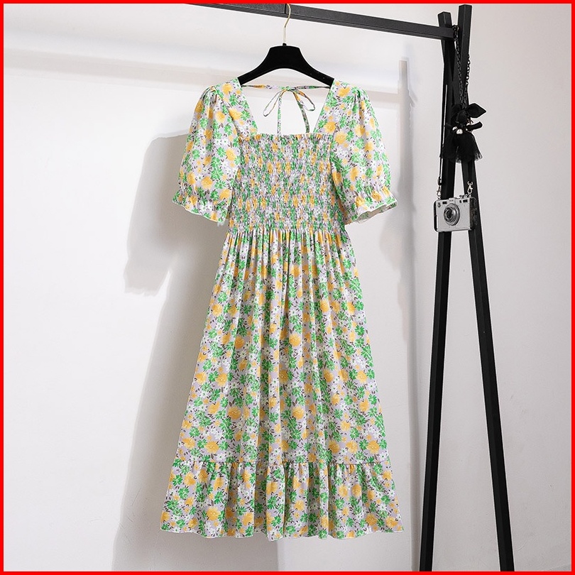 Gaun Musim Panas Kasual Baru Lengan Pendek Smocked Dress Lipit Bunga Dengan Dasi Belakang