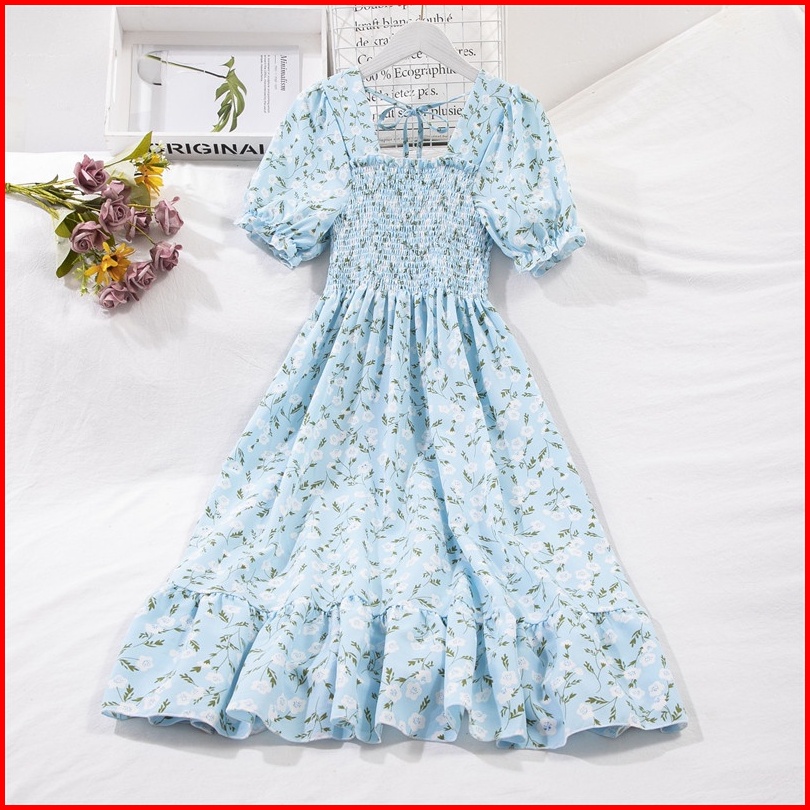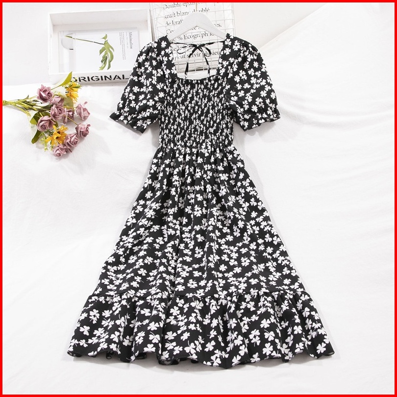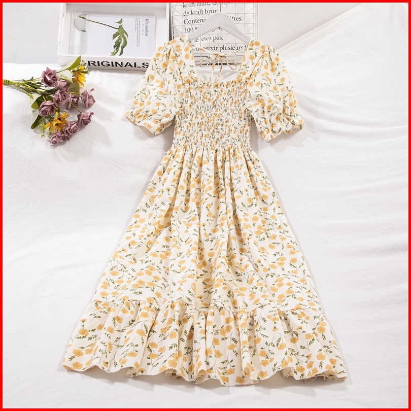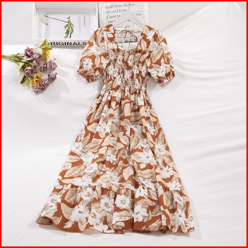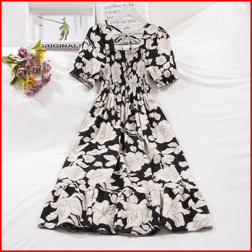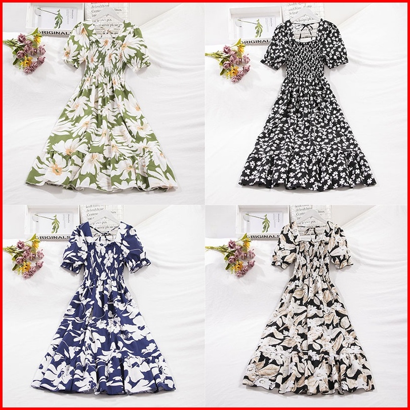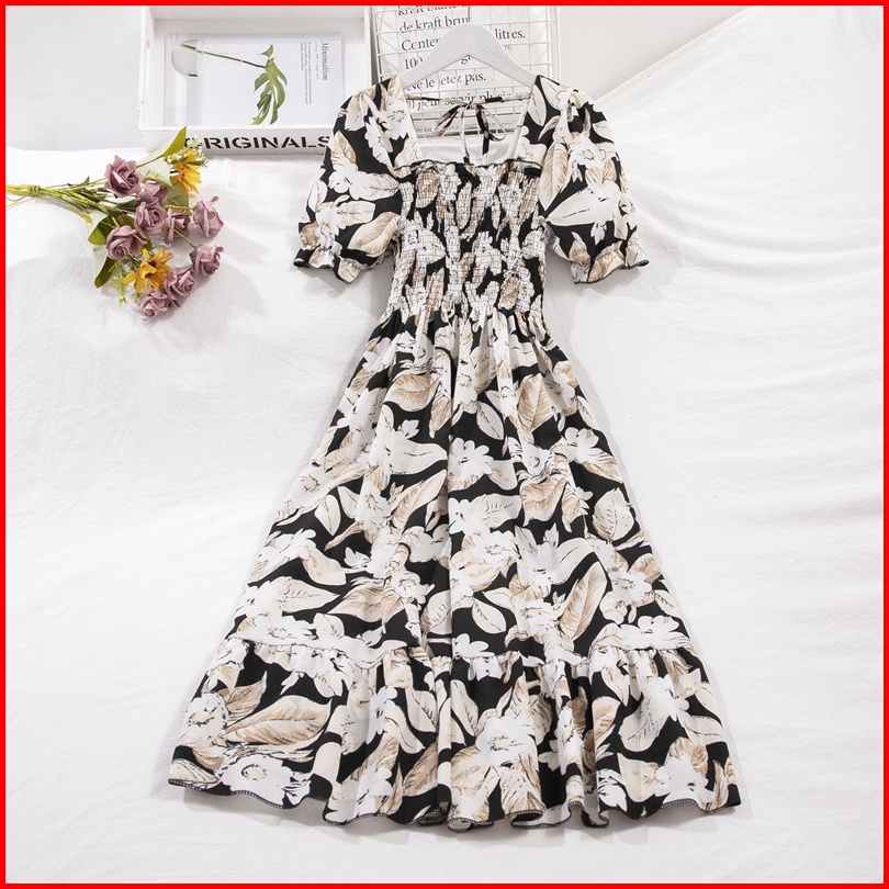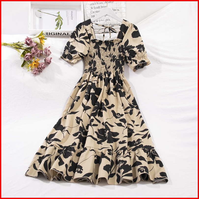 2023 Gaun Kasual Baru Dress Bunga Lengan Pendek Smocked Dengan Dasi Belakang