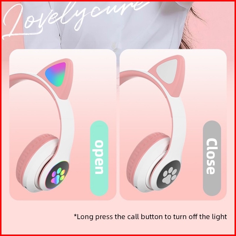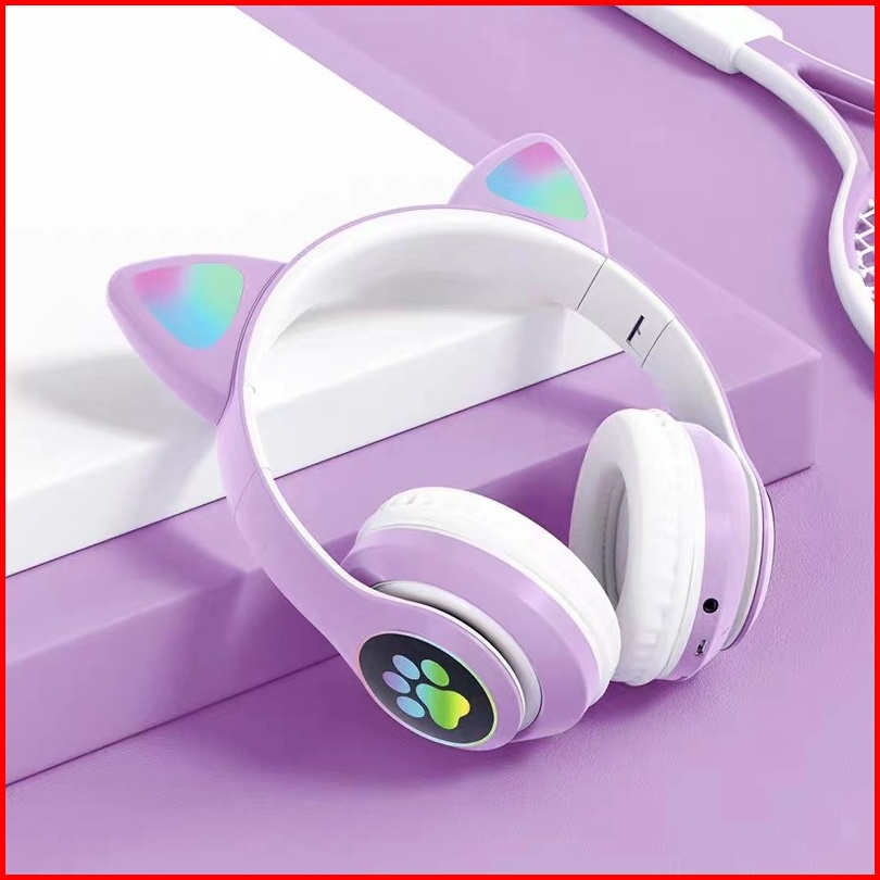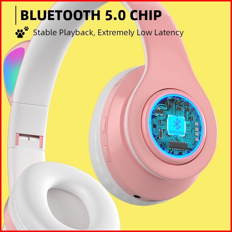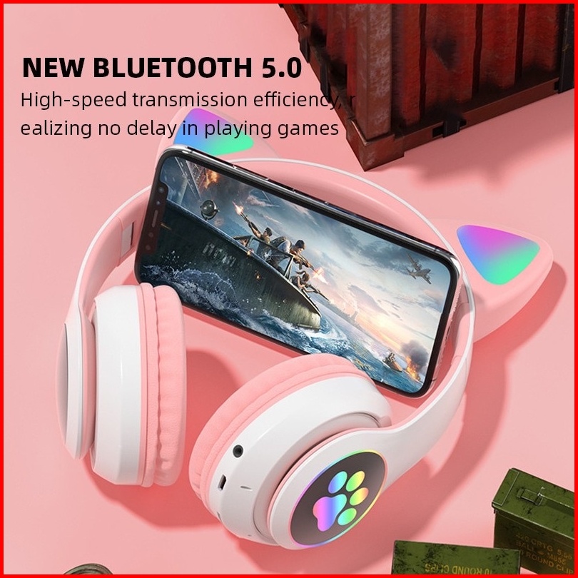 Headset Headphone Bluetooth Gaming Kucing Android Bass Led Light With Mic Foldable Hifi Stereo Headset