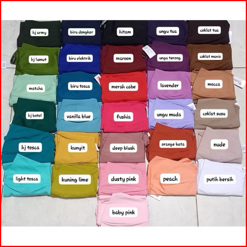 Hitam, Putih, Mocca, Biru Dongker, Abu Tua, Abu Muda, Coklat Susu, Cokelat Tua, Dusty Pink, Hijau Army, Putih Tulang, Merah Maroon, Biru Elektrik, Merah Cabe, Ungu Tua, Vanilla Blue, Hijau Botol, Peach, Biru Tosca, Deep Blush, Denim, Kuning Lime, Nude, Matcha, Lavender, Kuning Kunyit, Orange Bata, Baby Pink, Ungu Muda, Fuschia, Tosca Muda, Hijau Lumut, Coklat Manis, Merah Hati, Ungu Terong