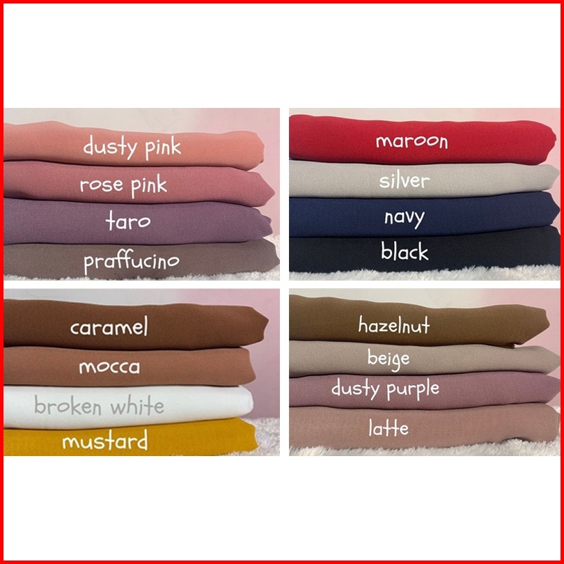 Hitam, Navy, Mocca, Maroon, Silver, Dusty Pink, Matcha/Sage, Olive, Milo, Broken White, Abu Tua, Taro Purple, Coffee, Beige, Praffucinno, Army