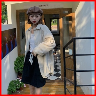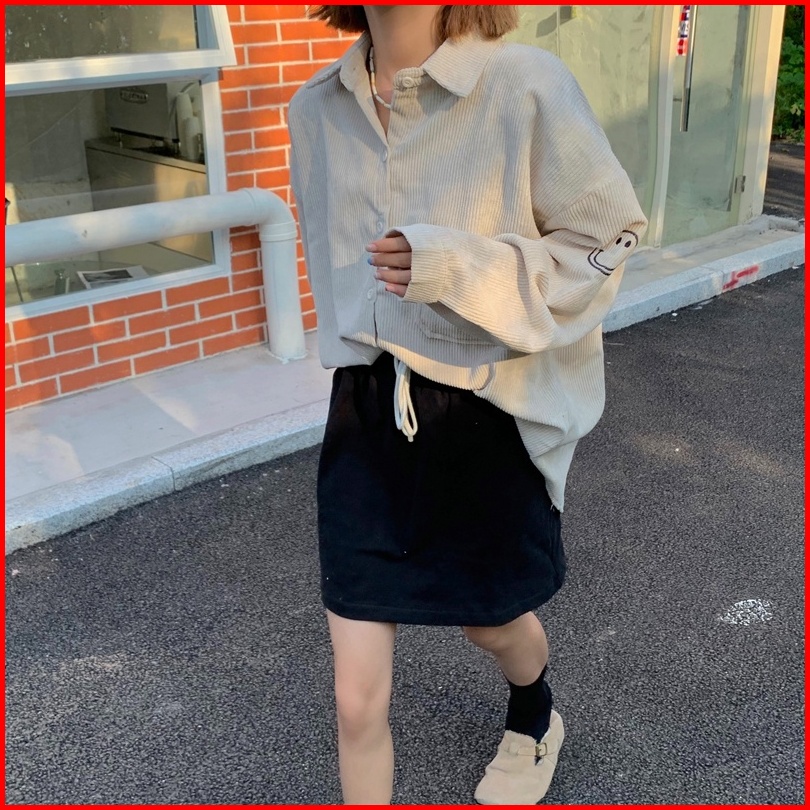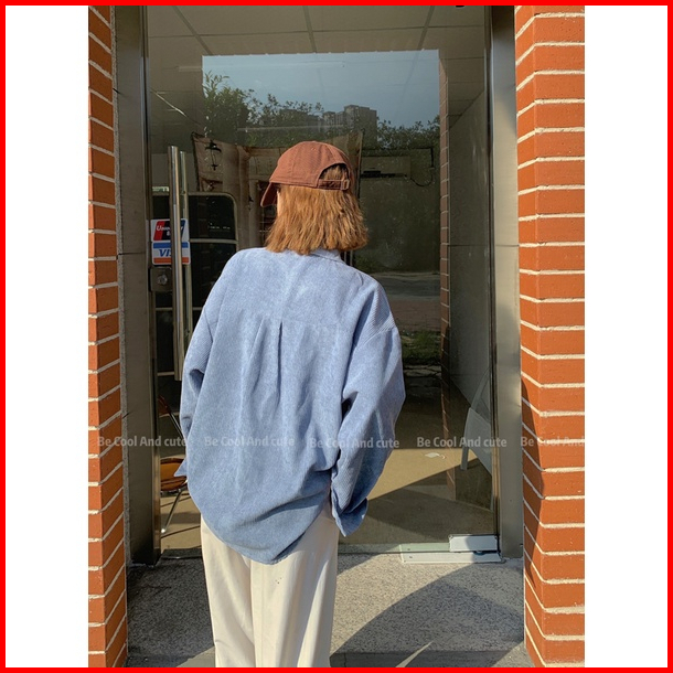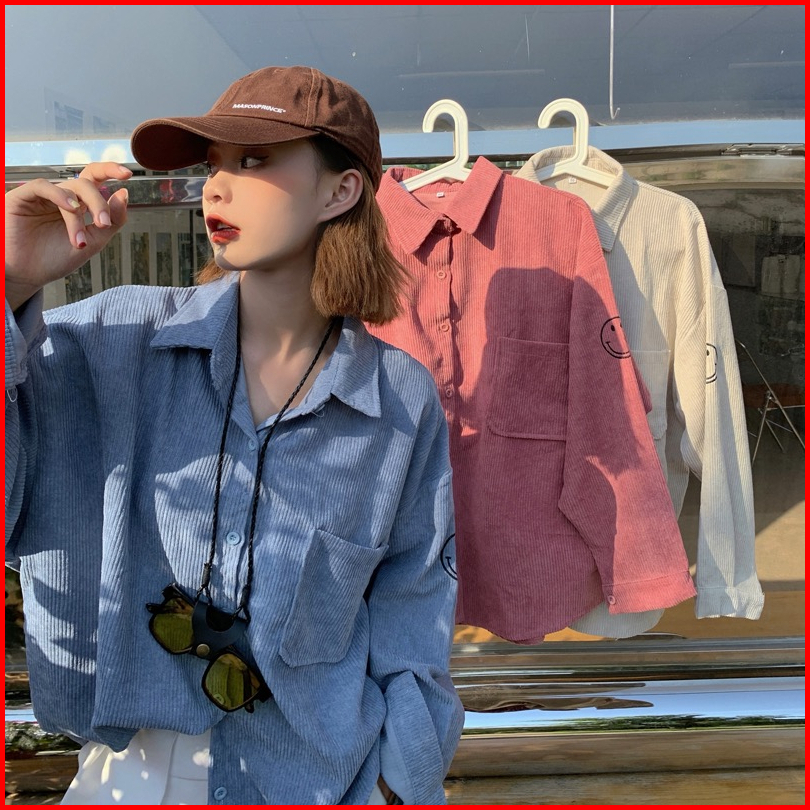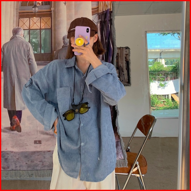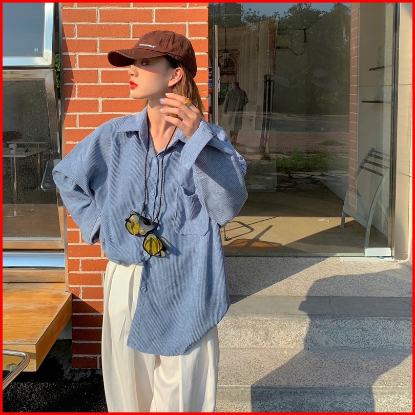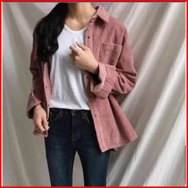 Chaoo.id Corduroy Shirt Kemeja Lengan Panjang Wanita Retro Korean Style Baju Atasan Wanita Oversize Import Kekinian Ootd