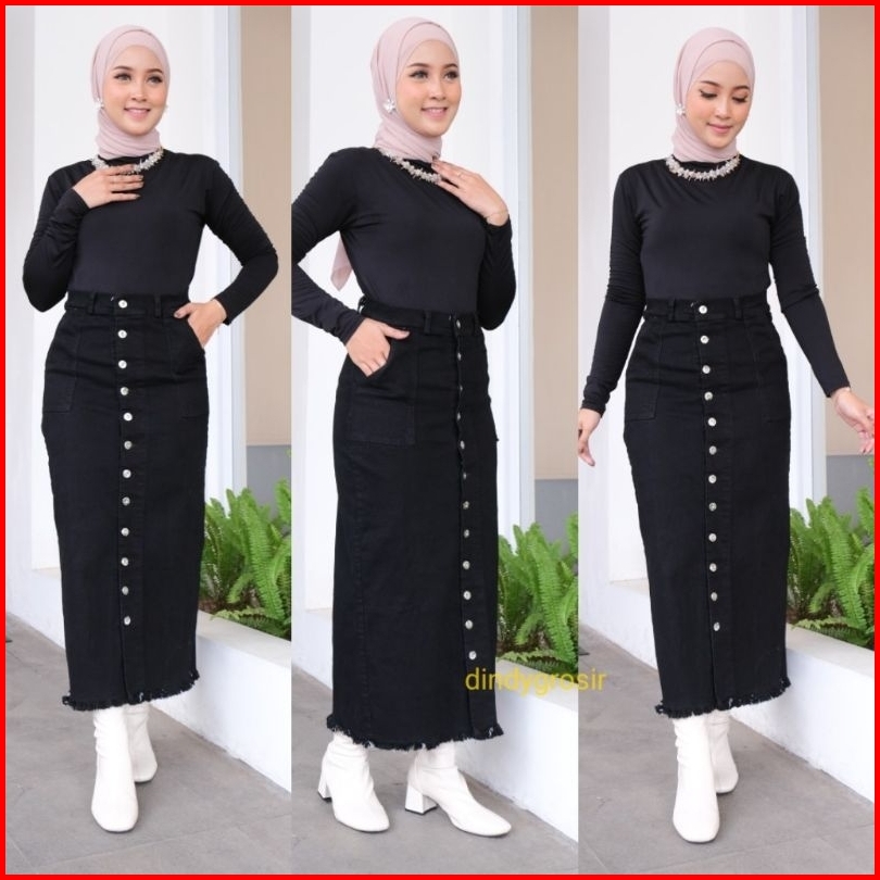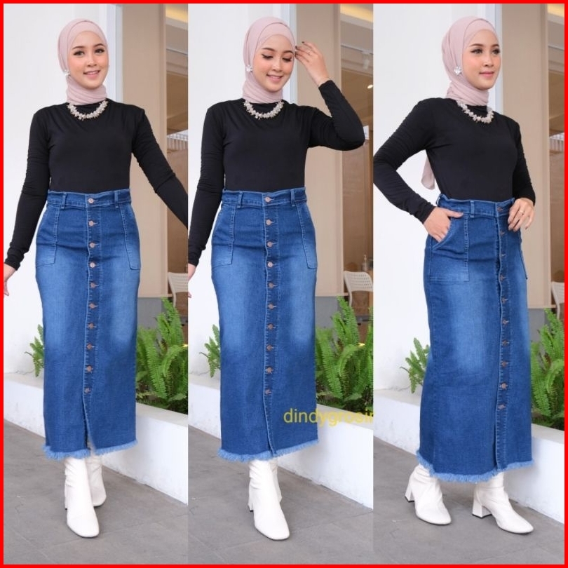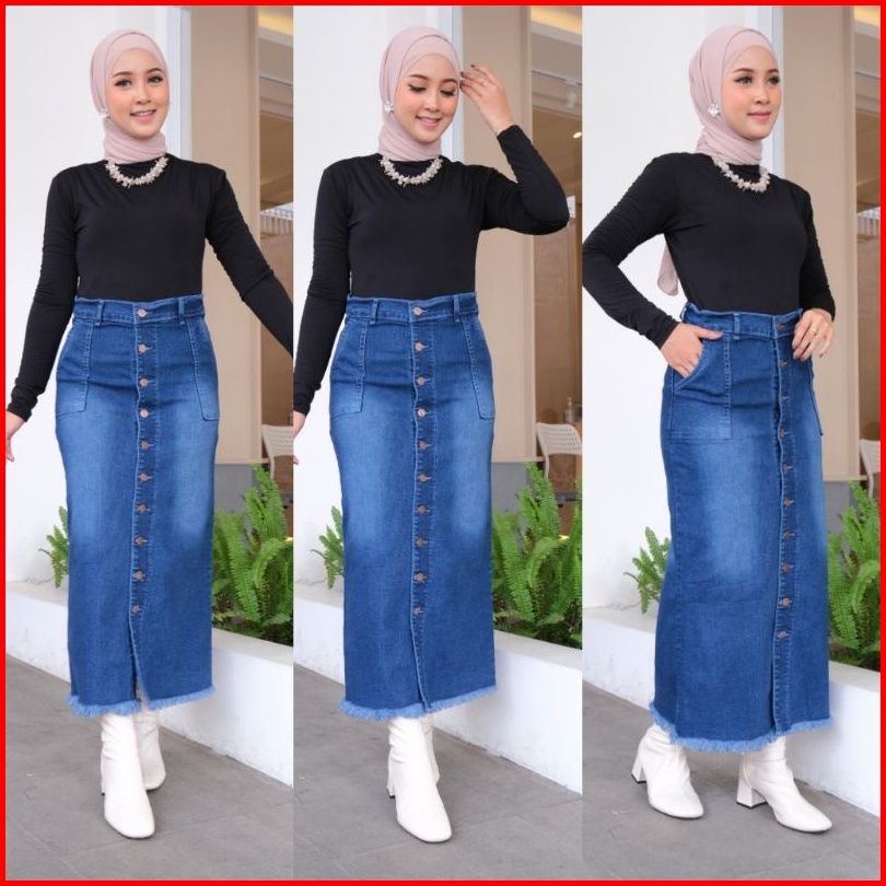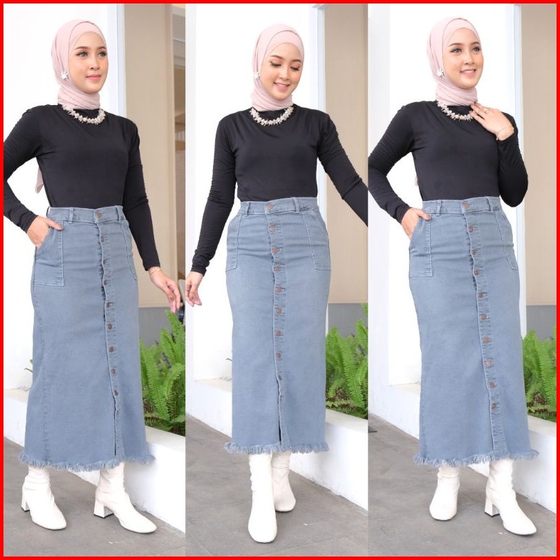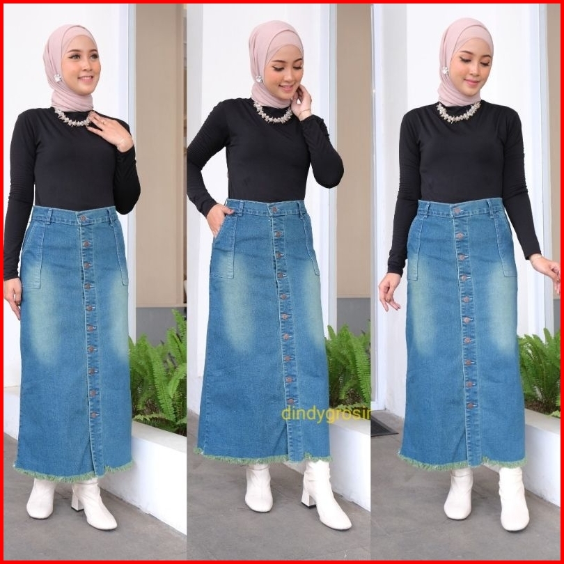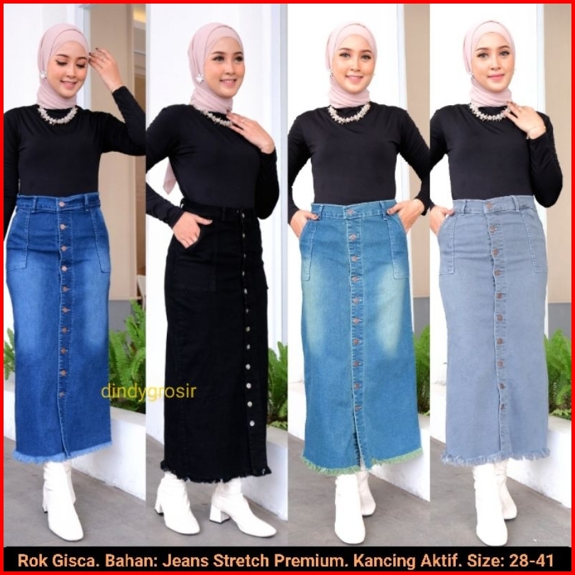 Rok Jeans Stretch Span Panjang Gisca Kancing Depan Tebal Dan Melar