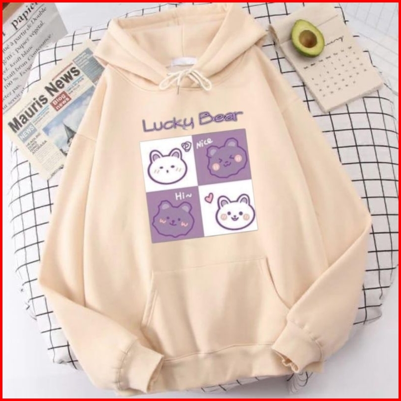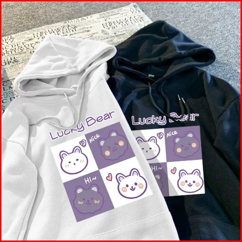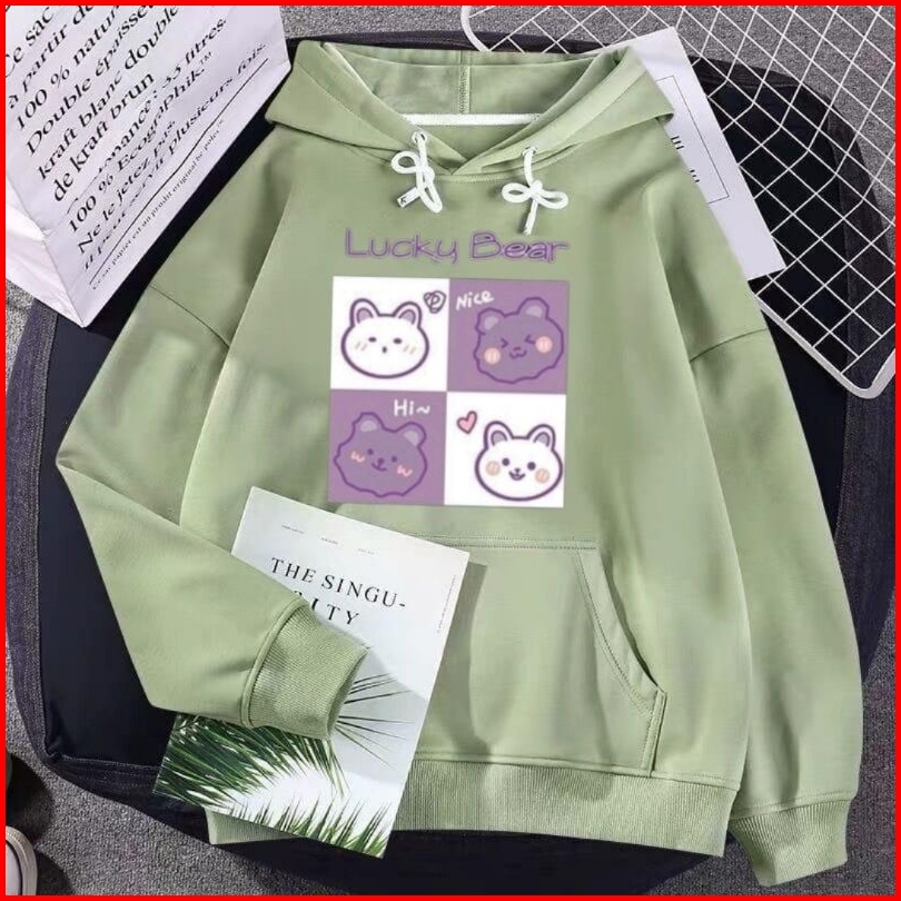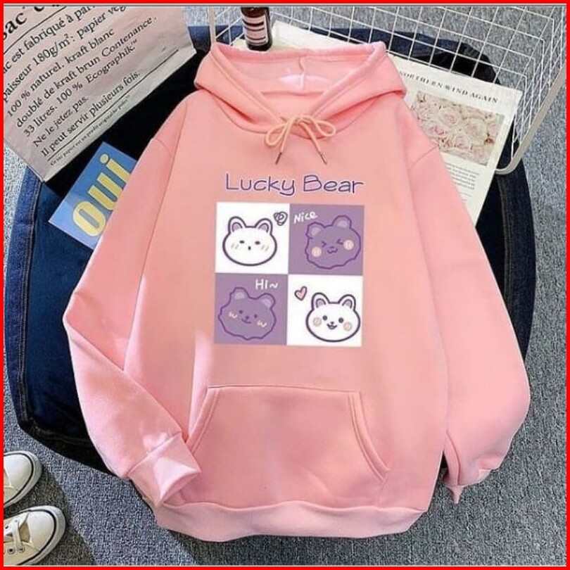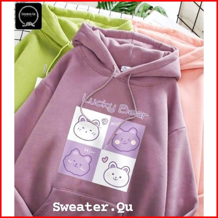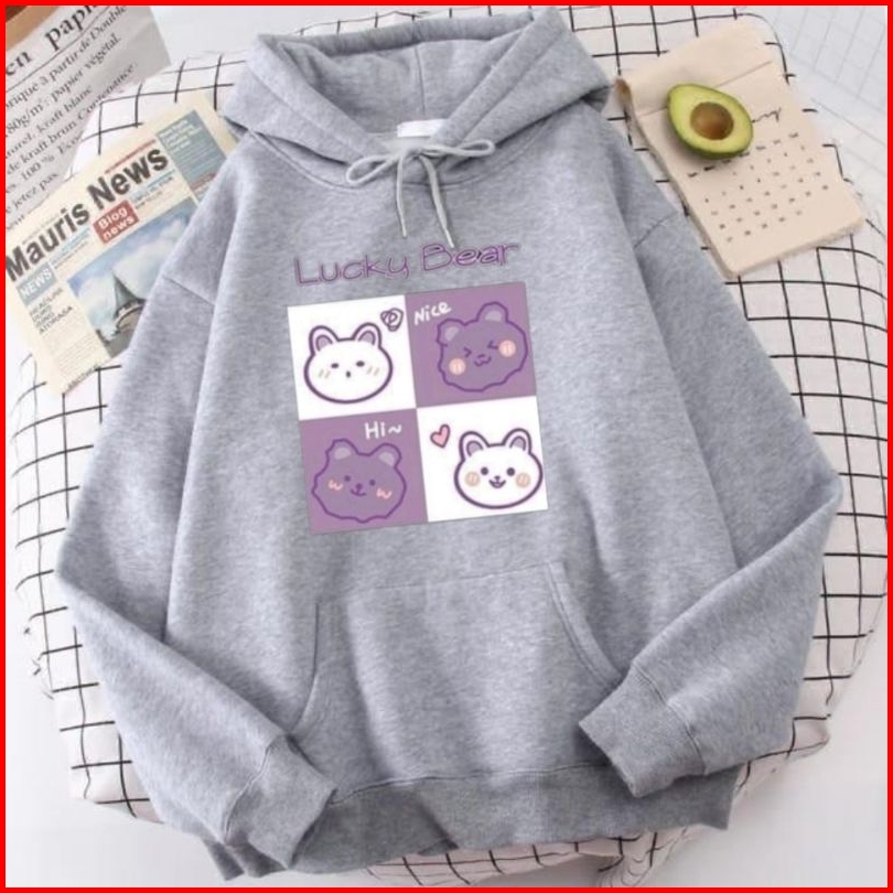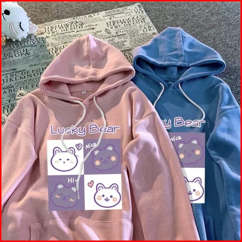 Jumper Hoodie Anak Cewek Lucky Bear Kitty Lilac Sweater Bahan Fleece Tebal Untuk Usia 5 - 16 Tahun