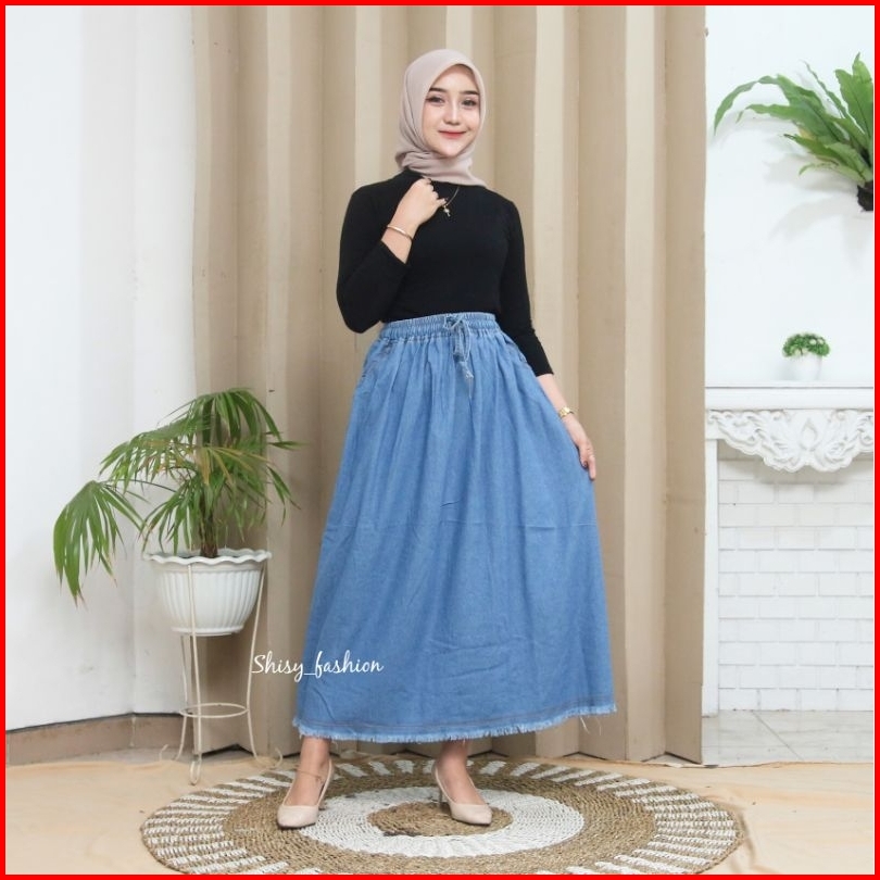 Shisy Fashion - Rok Jeans Panjang Polosan Jumbo Tali Aktif Rok Panjang Jeans Jumbo Polosan Tali Aktif