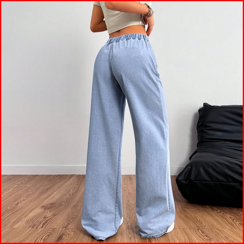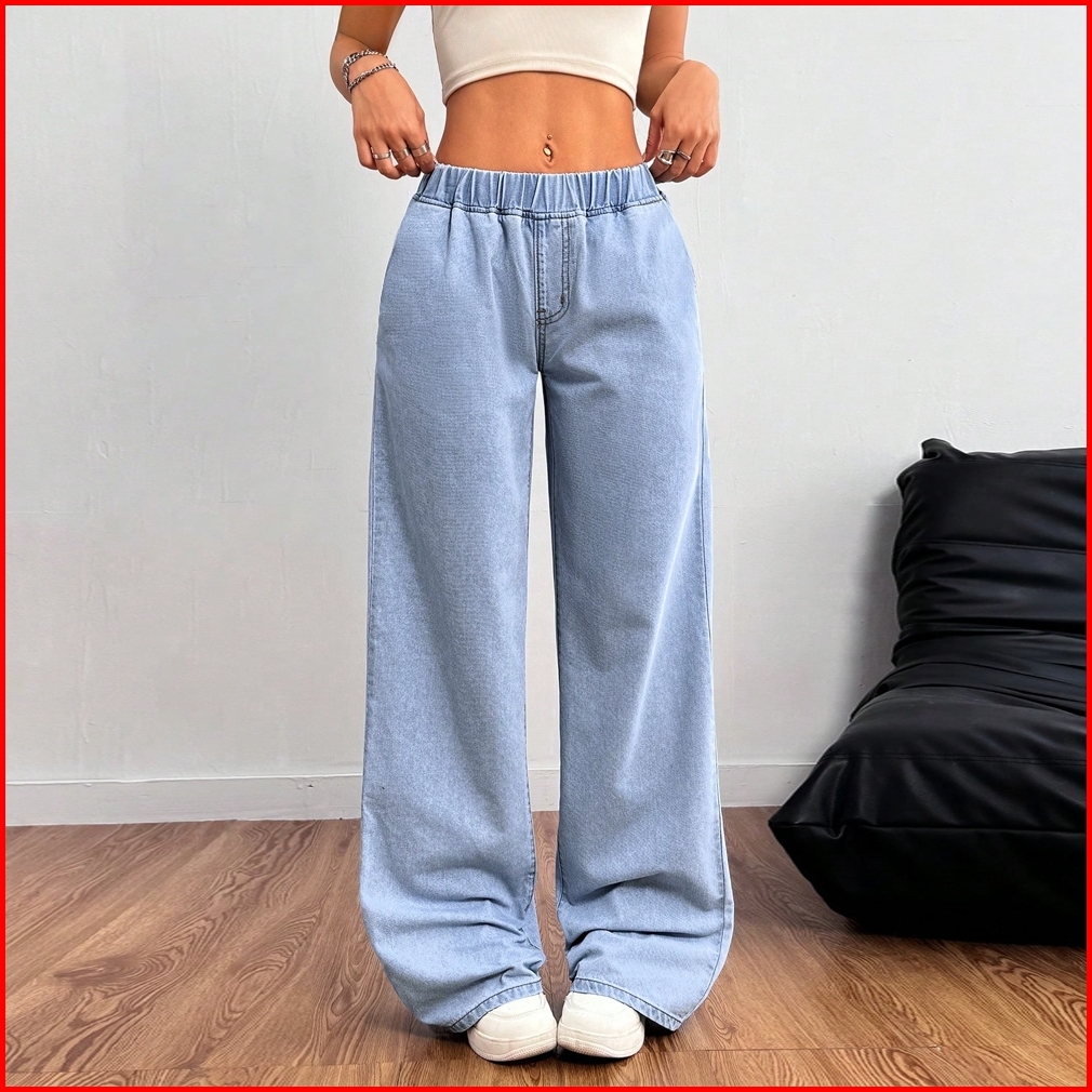 Celana Jeans Wanita Terbaru Elastic Waistband Casual Solid Color Straight Ladies Baggy Denim Pants