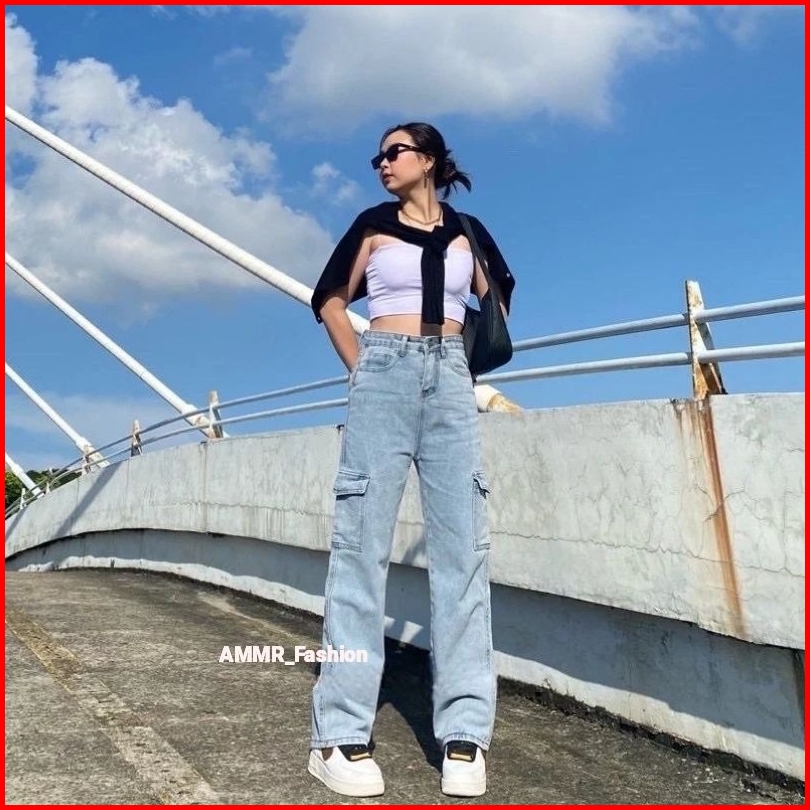 Celana Jeans Wanita Cargo Highwaist Kulot Loose