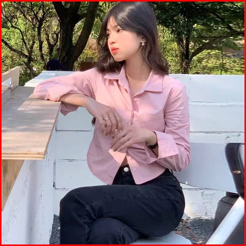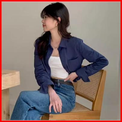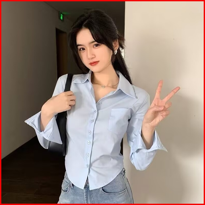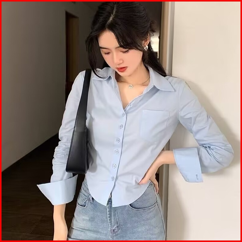 Kemeja Wanita Lengan Panjang Gaya Korea Kemeja Kasual Warna Polos Kemeja Wanita Lengan Panjang Biru
