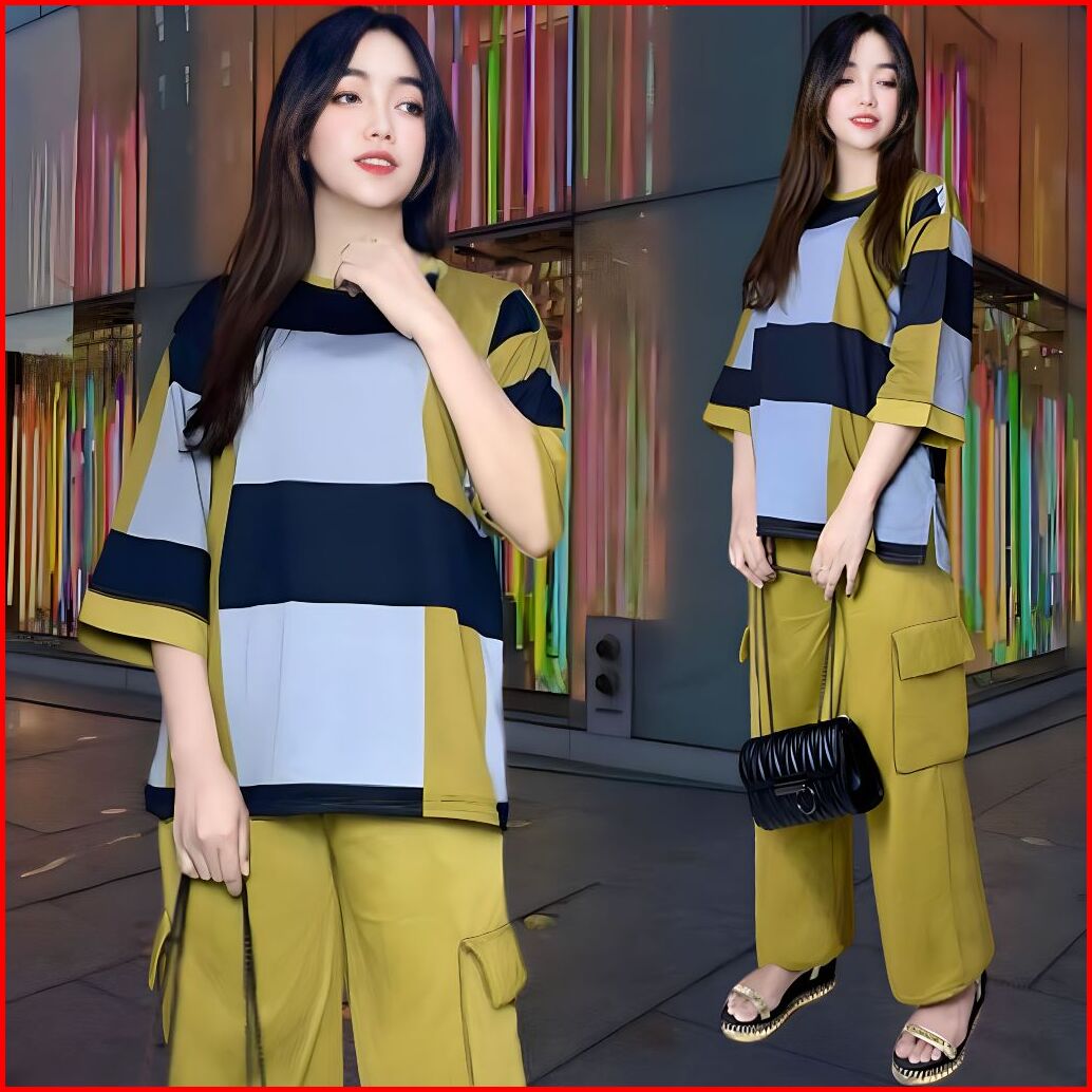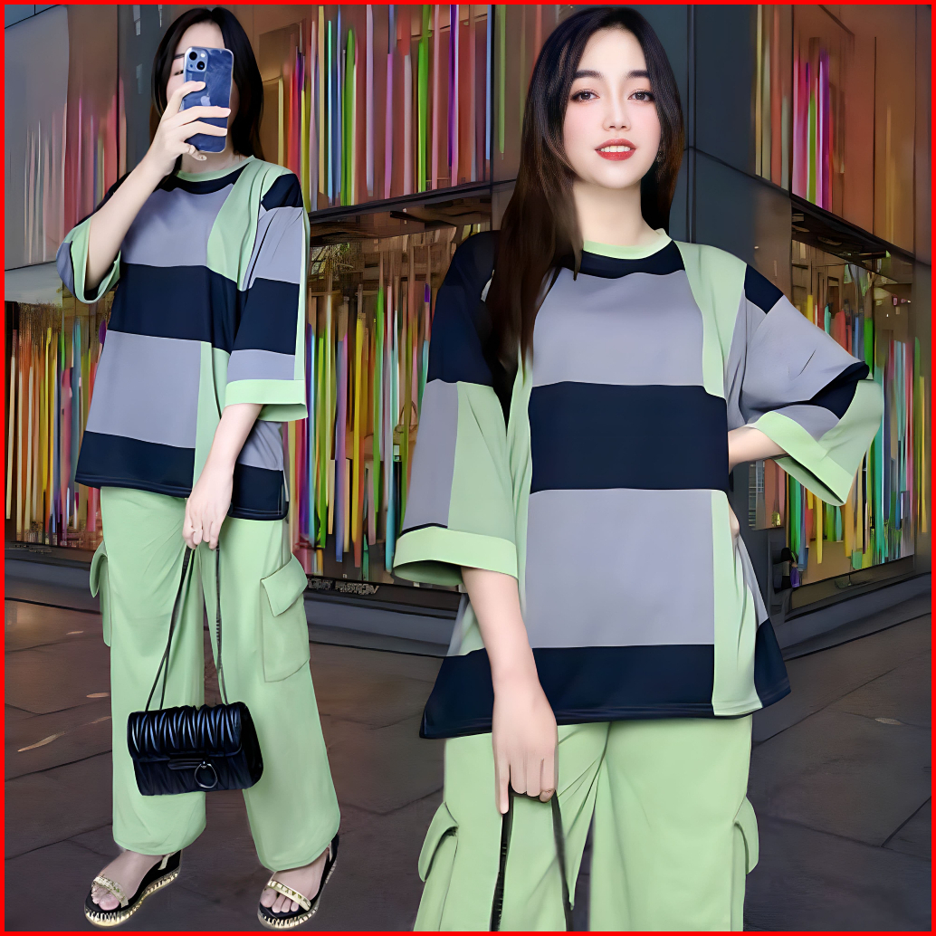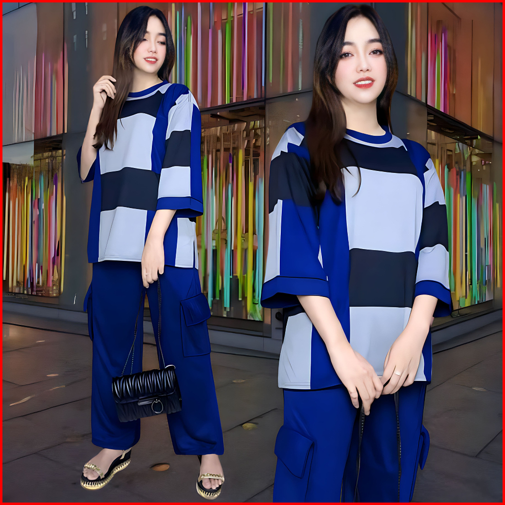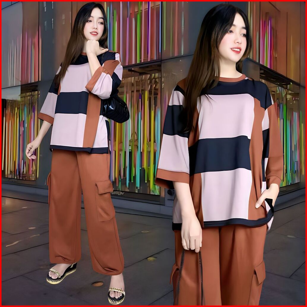 Faustina Ld 120 Setelan Vistaterry Wanita Celana Cargo Dan Atasan Oversize Wanita Baju Kantong Kulot Karet Kaos Santai M