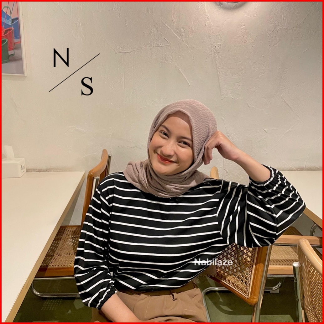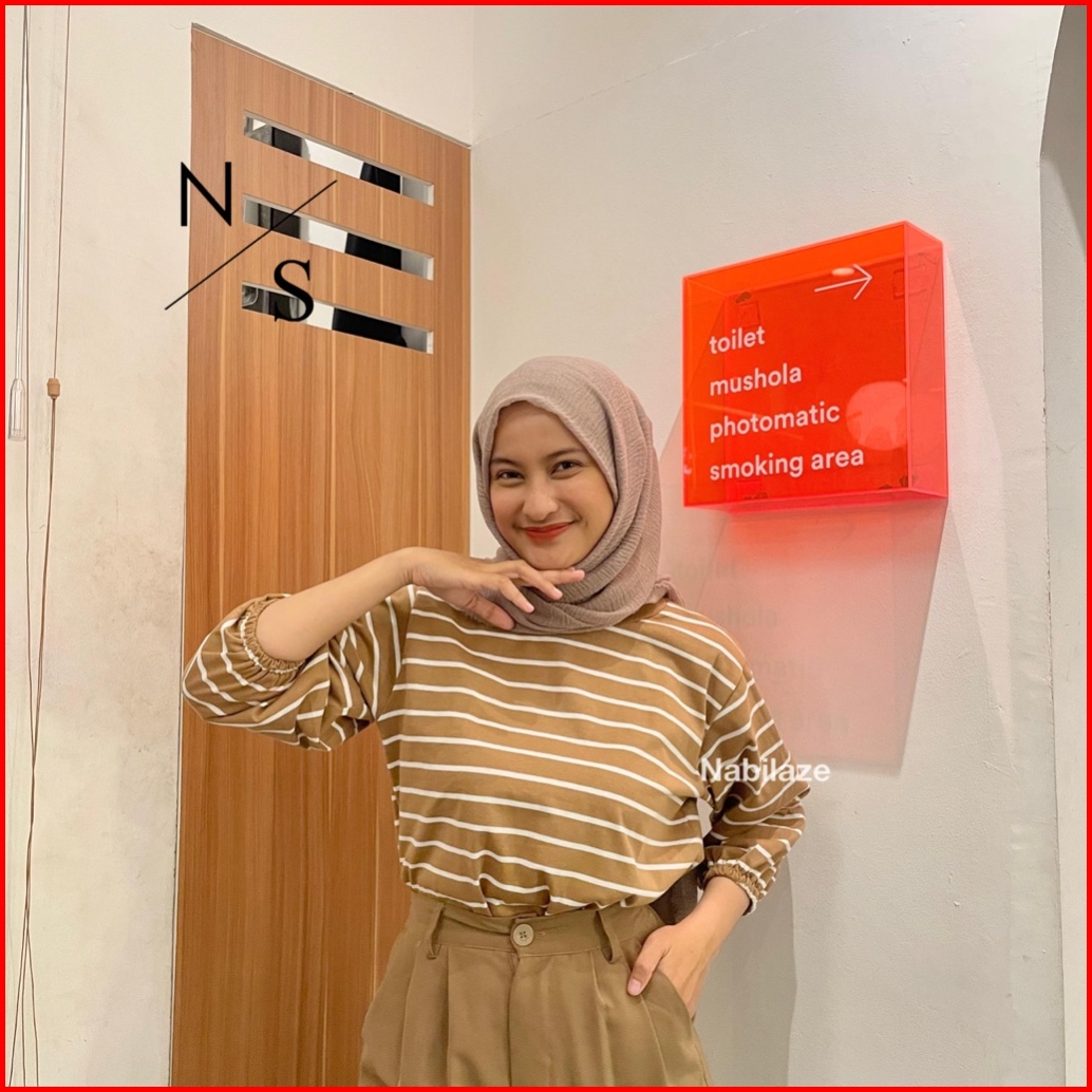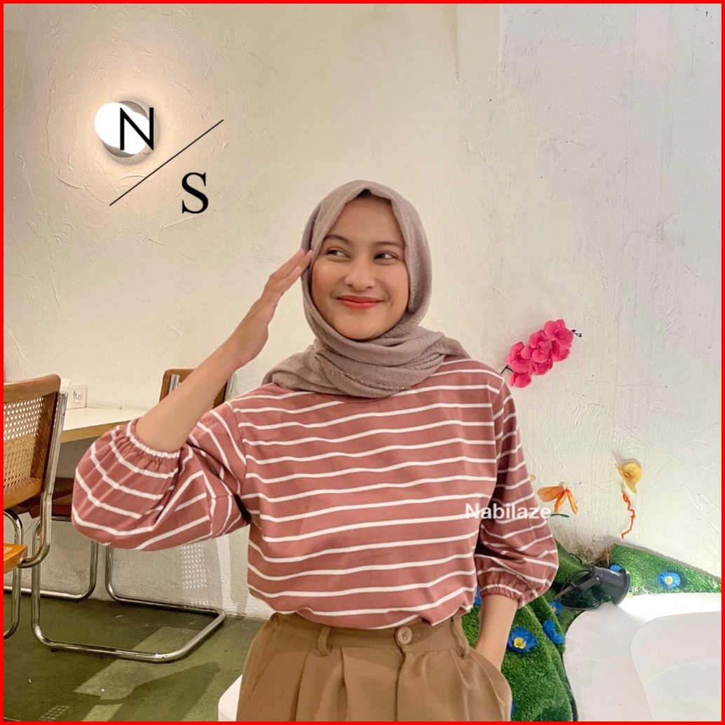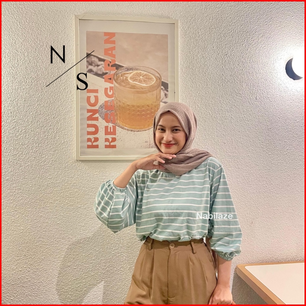 Blouse Atasan Wanita Salur Stripe Lengan Balon Katun