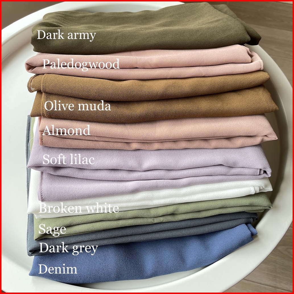 Hitam, Rose Mauve, Denim, Dark Army, Sage, Olive, Dark Grey, Choco, Dusty Choco, Broken white, Soft Lilac, Burnt brick, Soft grey, Mauve mist, Almond, Paledogwood, Blush, Dusty rose, Butter, Ice grey, Peanut, Brick, Brown, Brown sugar, Wheat, Macchiato, Salem