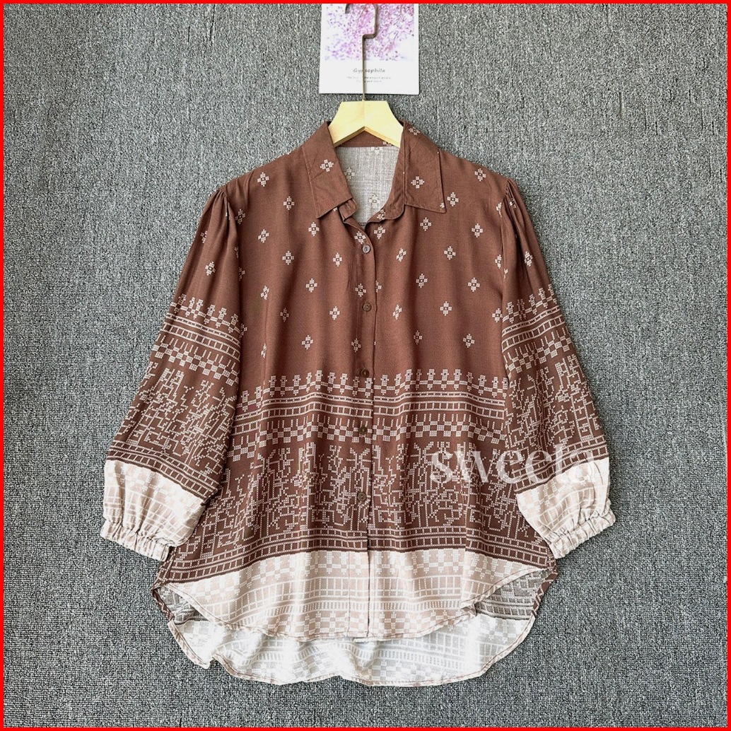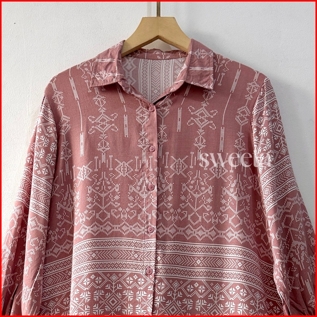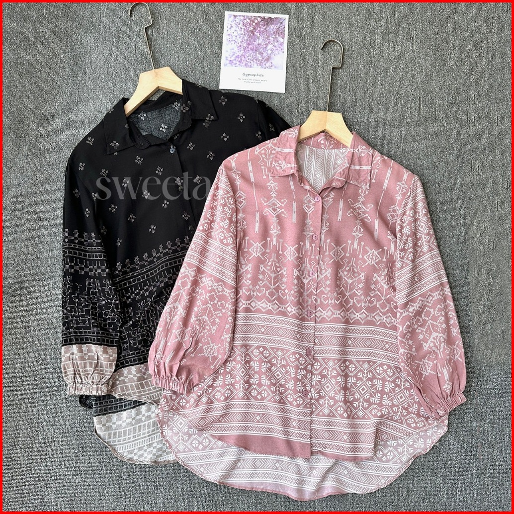 Sweeta Shirt Penguin Rayon Motif Etnic Lengan 7 8 Korea Style Ld 105cm Kemeja Kancing Aktif Atasan Pakaian Wanita