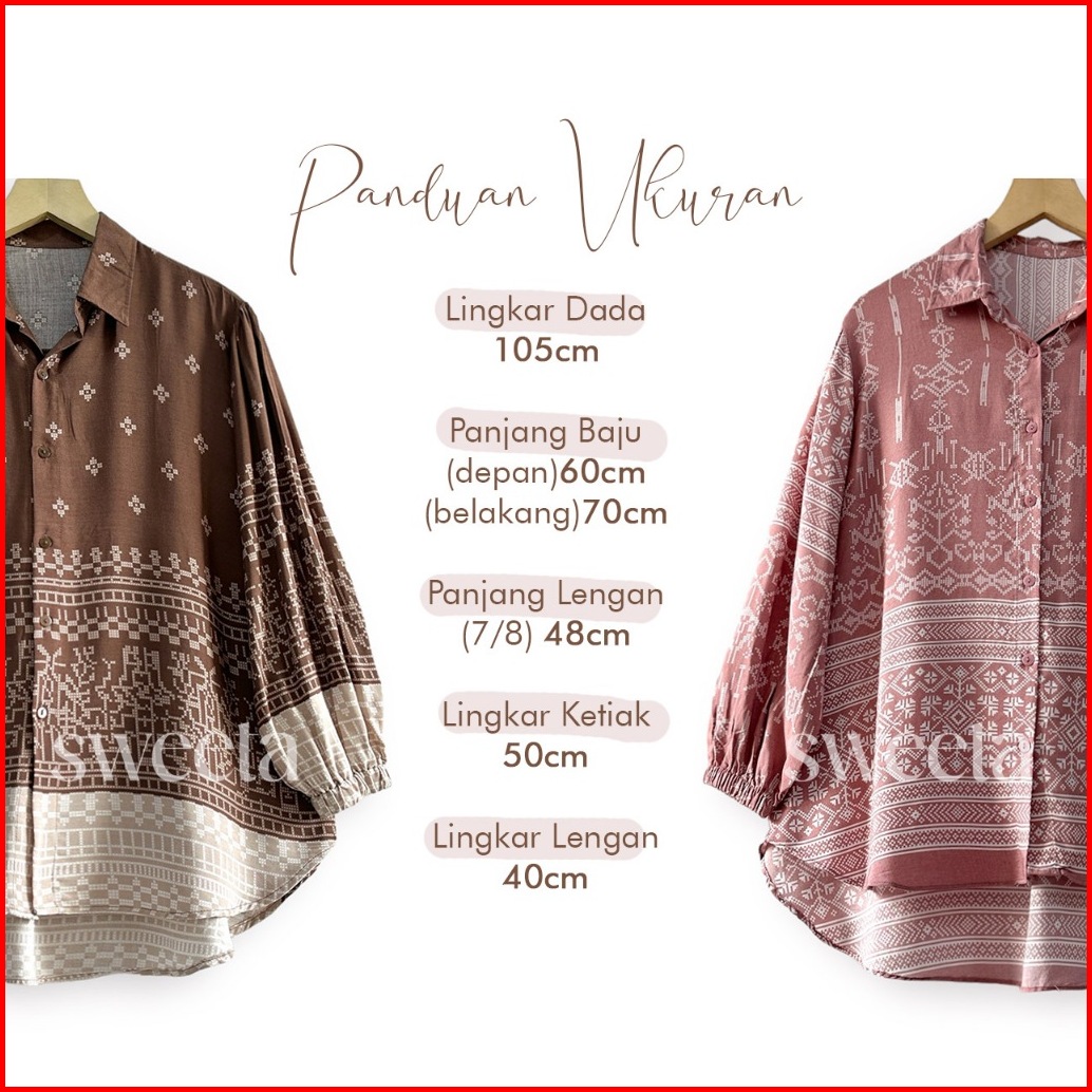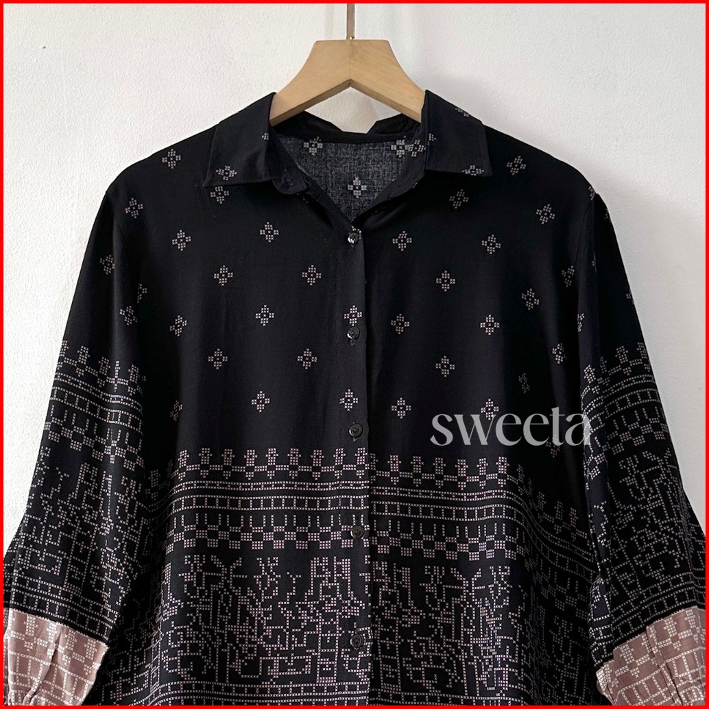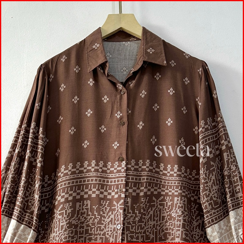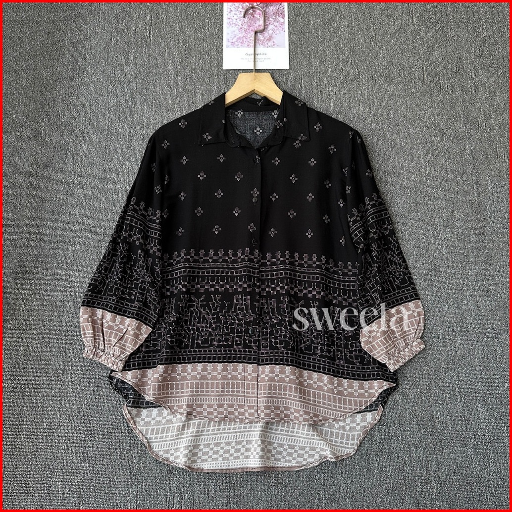 Sweeta Shirt Penguin Rayon Motif Etnic Lengan 7 8 Korea Style Ld 105cm Kemeja Kancing Aktif Atasan Pakaian Wanita