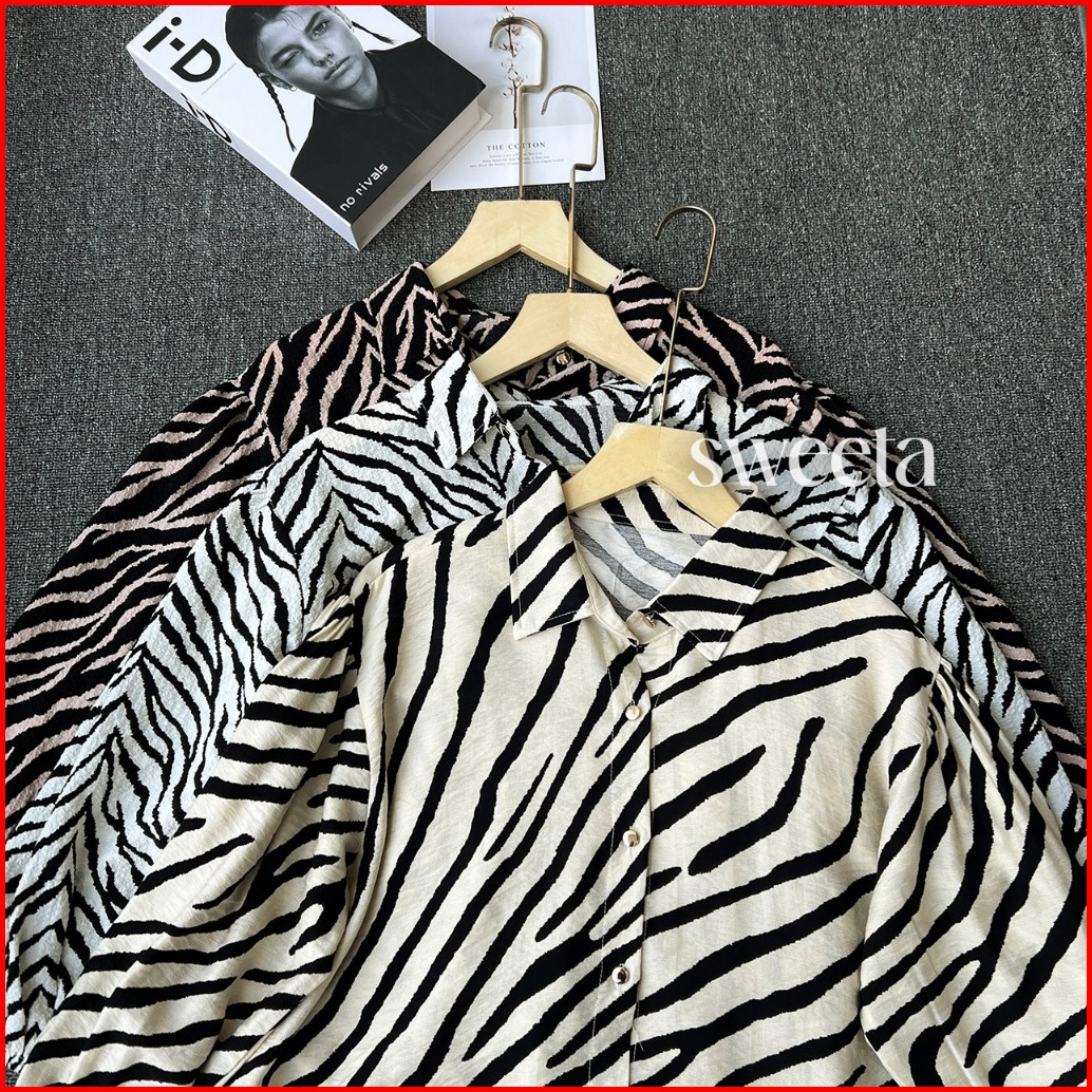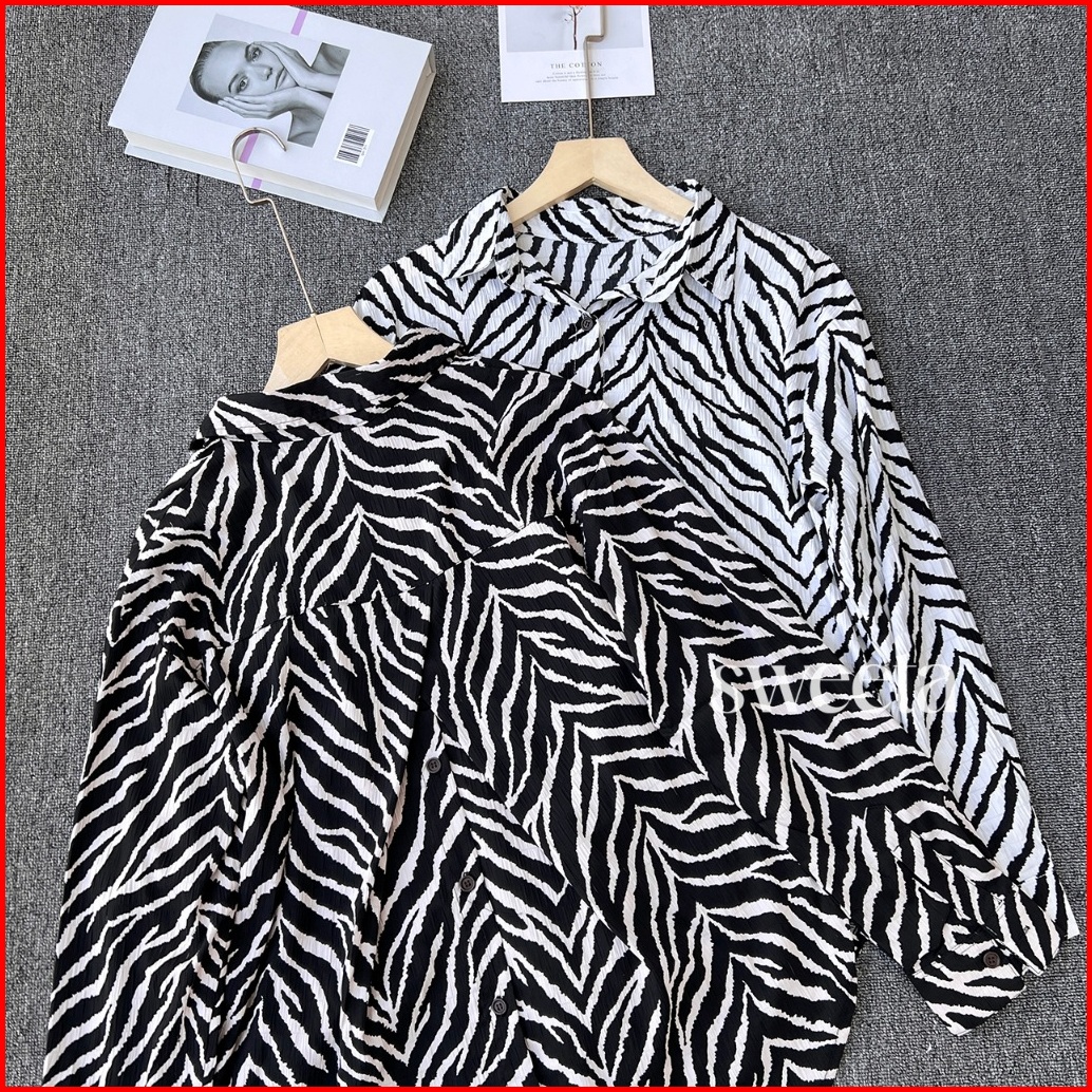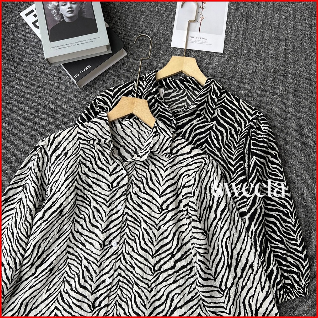 Sweeta Safari Shirt Penguin Motif Zebra Crinkle Airflow Ld 110cm Korea Style Oversize Kemeja Kancing Aktif Atasan Pakaia