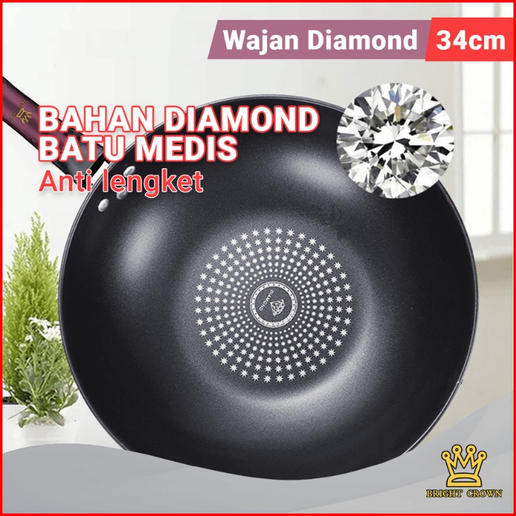 Bright Crown Wajan Penggorengan Wok Diamond 34cm Dengan Pegangan Anti Panas Fry Pan Anti Gores Tebal