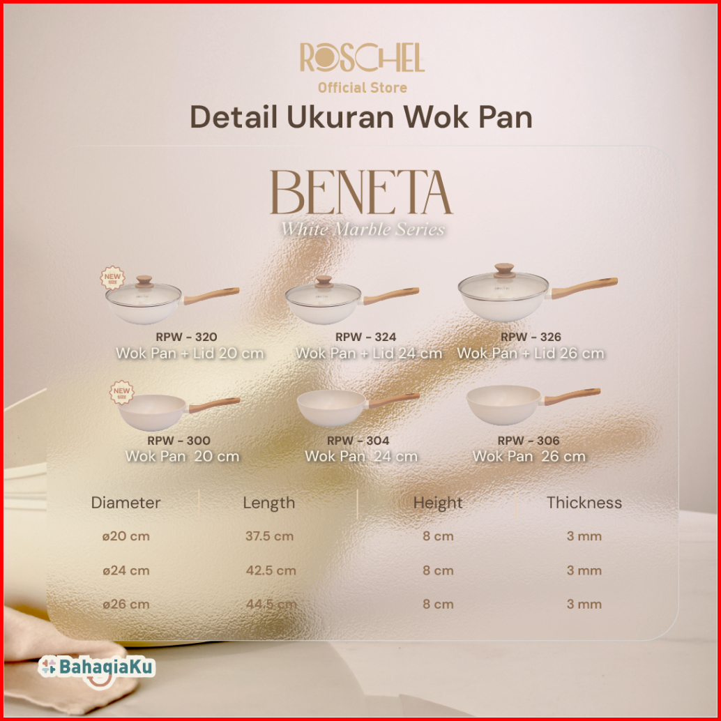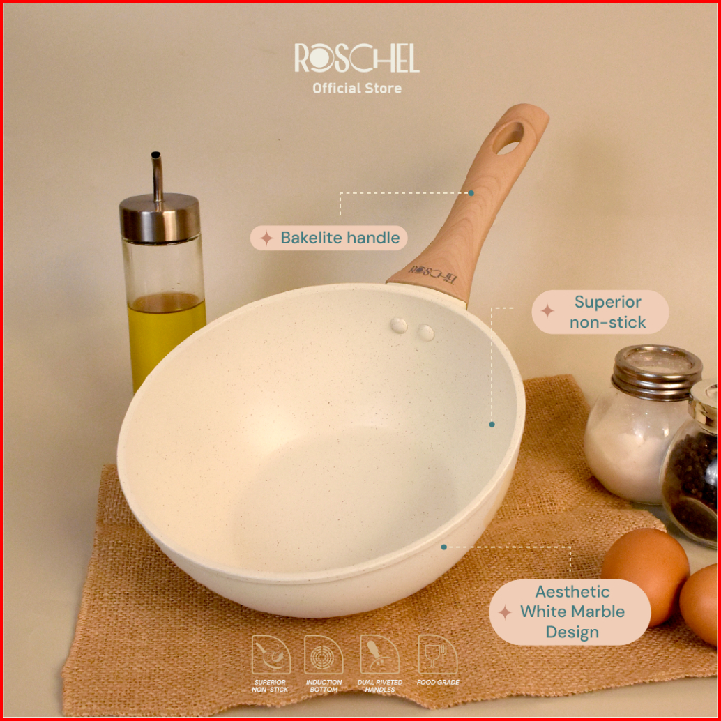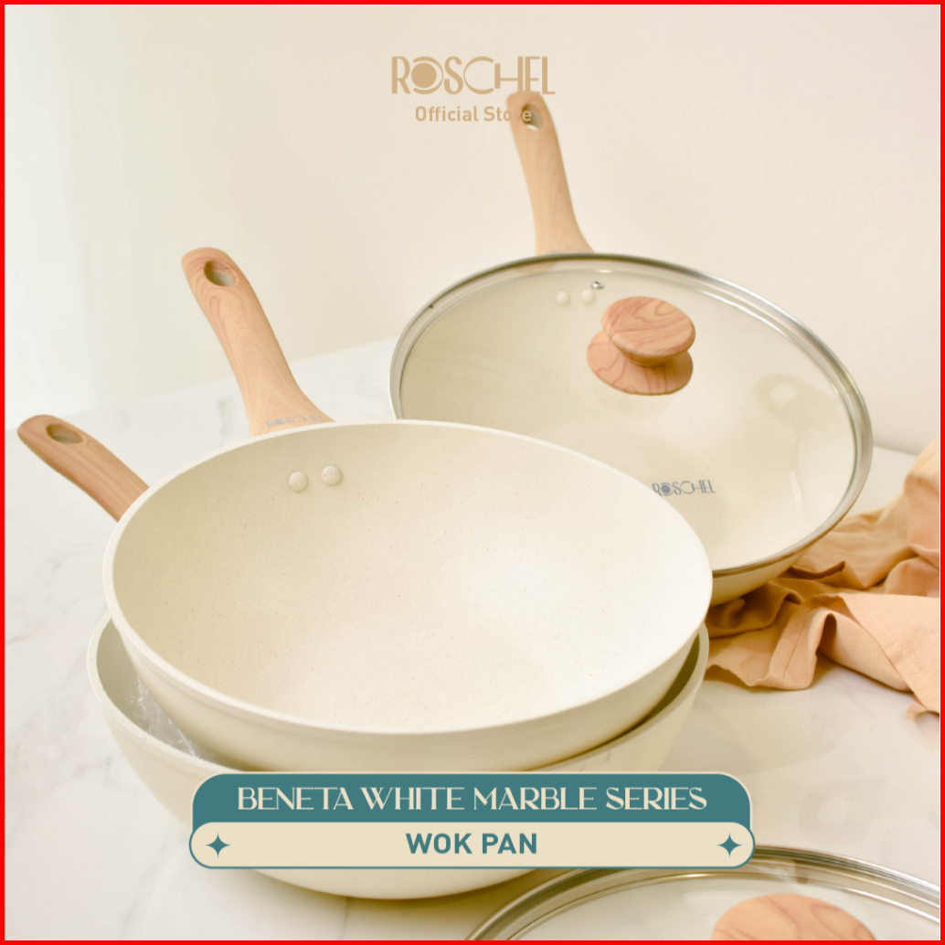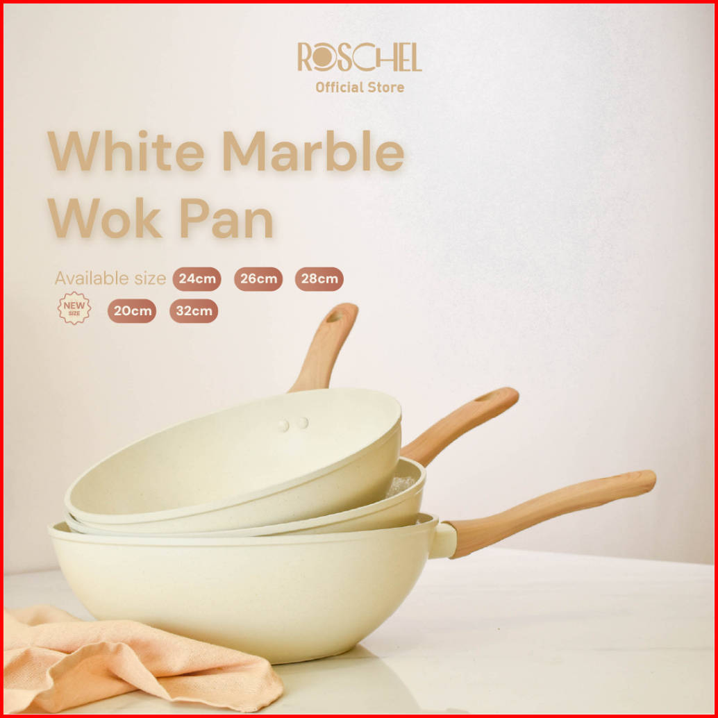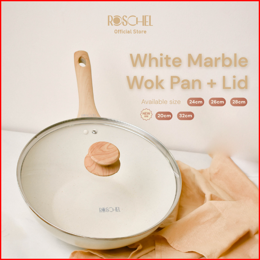 Roschel Beneta White Marble Coating Non-stick Wok Pan 20 24 26 28 32 Cm Tutup Kaca Panci Wajan Penggorengan Anti Lengket