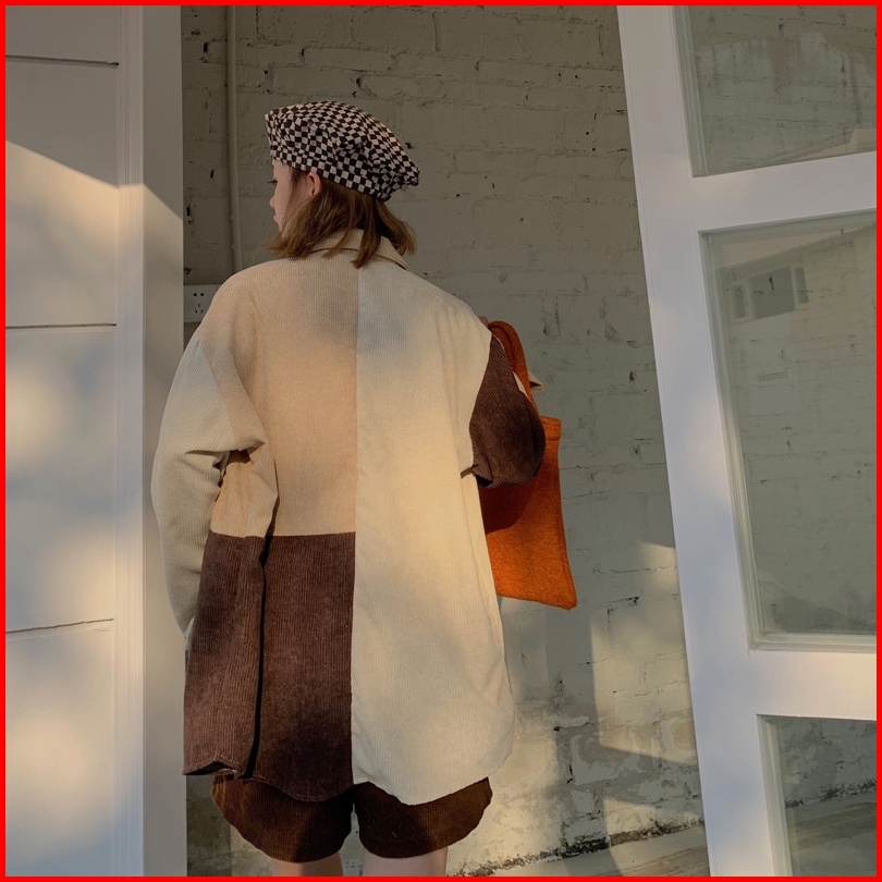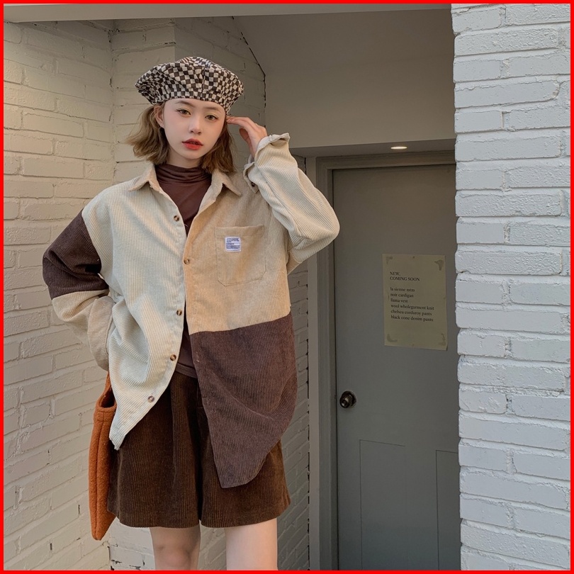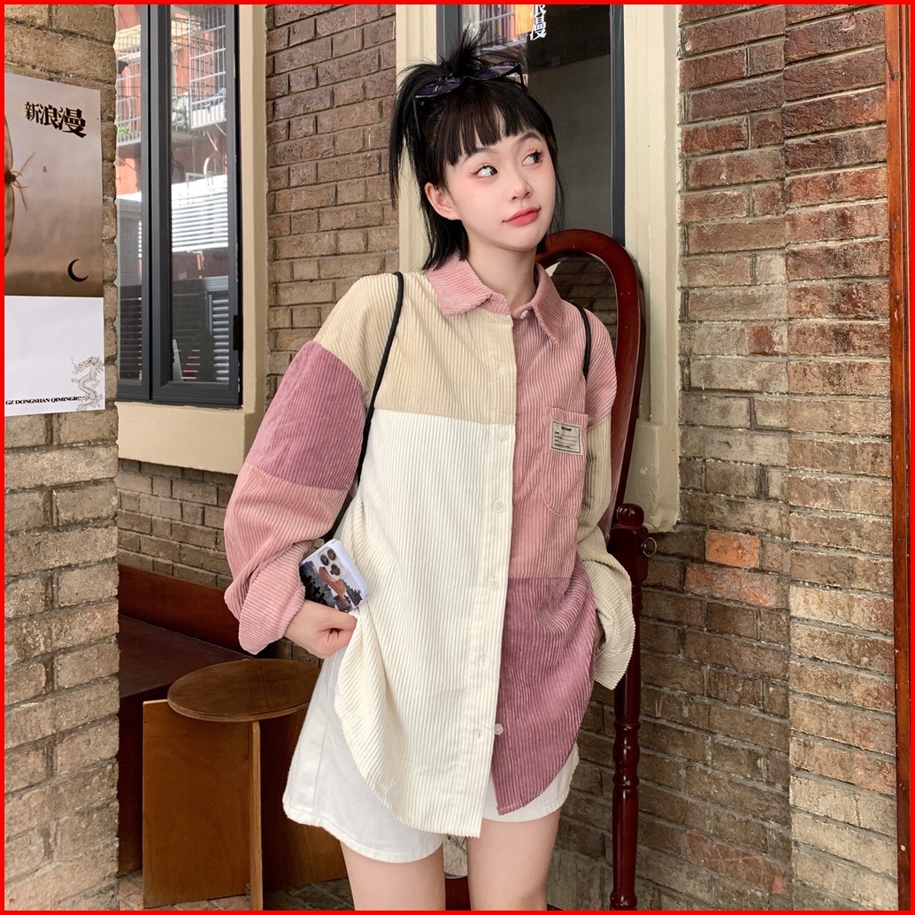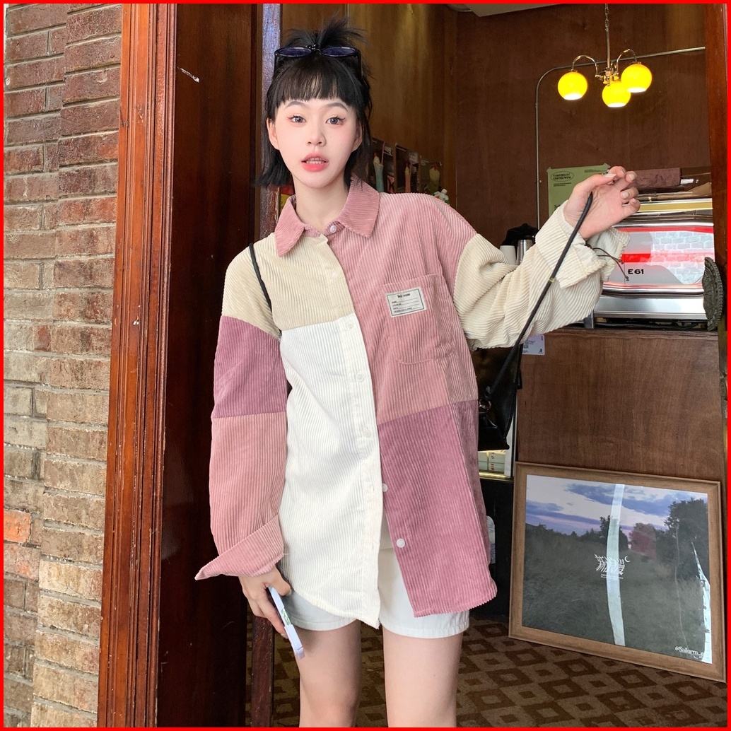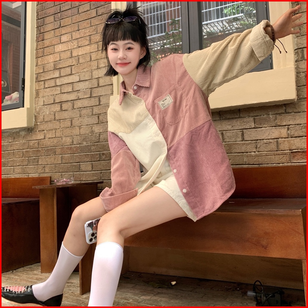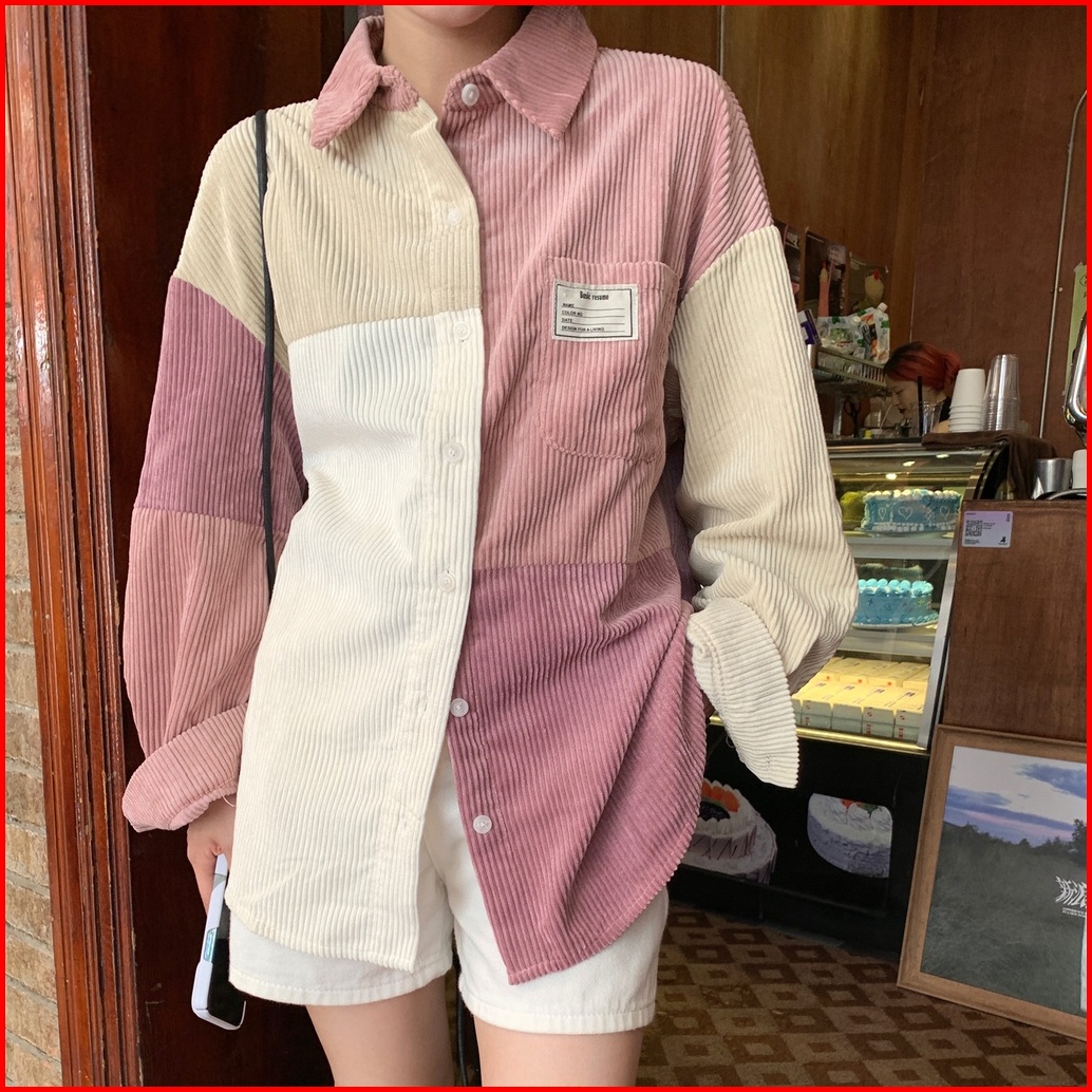 Yuruma Kemeja Korduroi Gaya Korea Jahitan Warna Kontras Atasan Lengan Panjang Gadis Pink