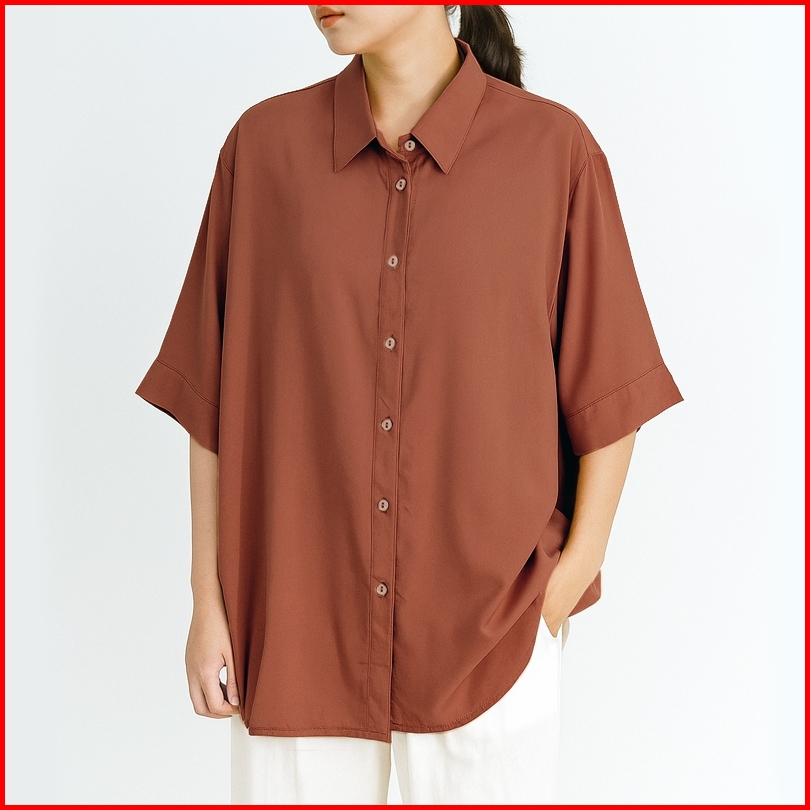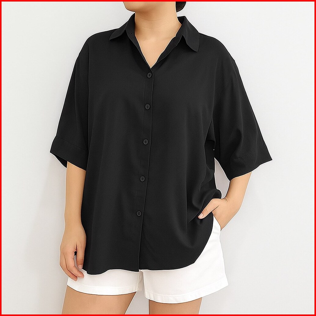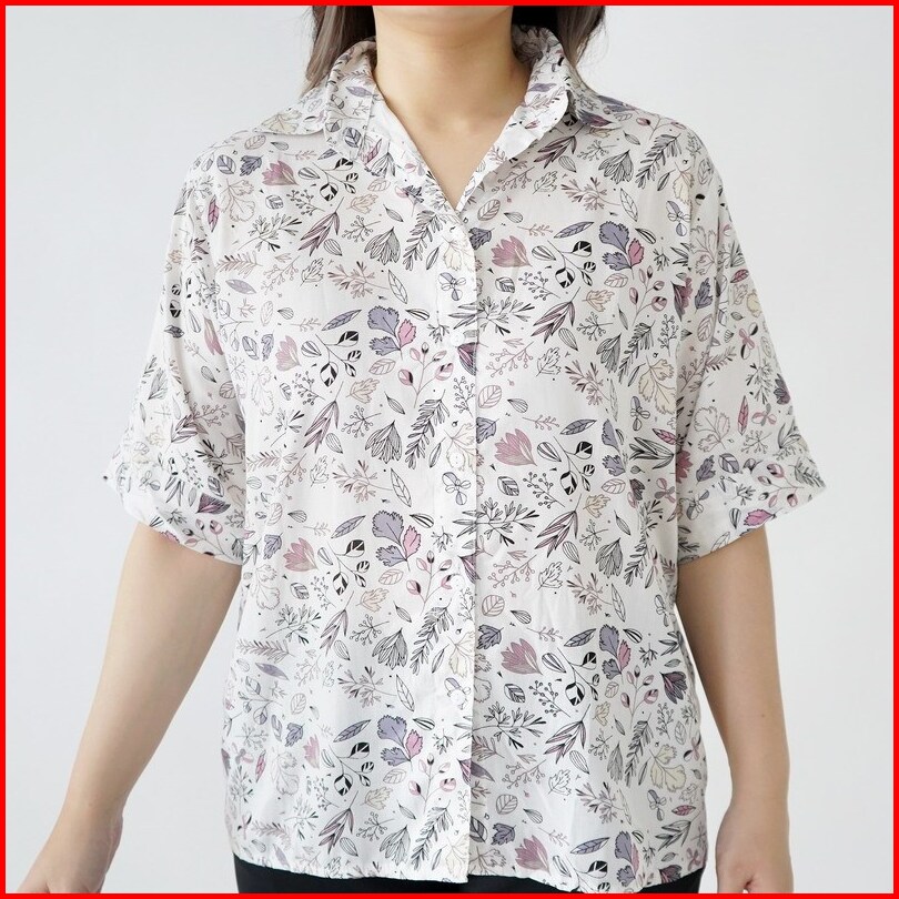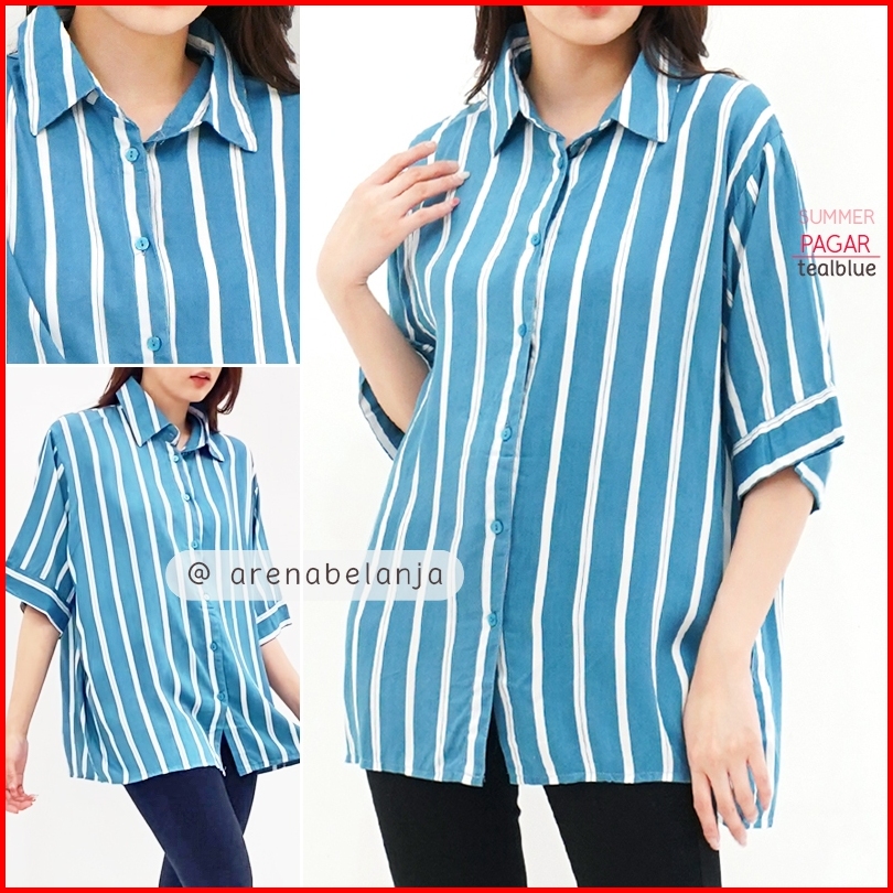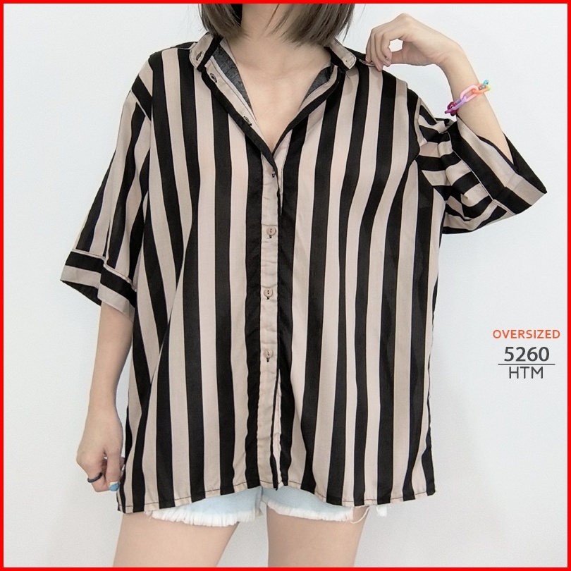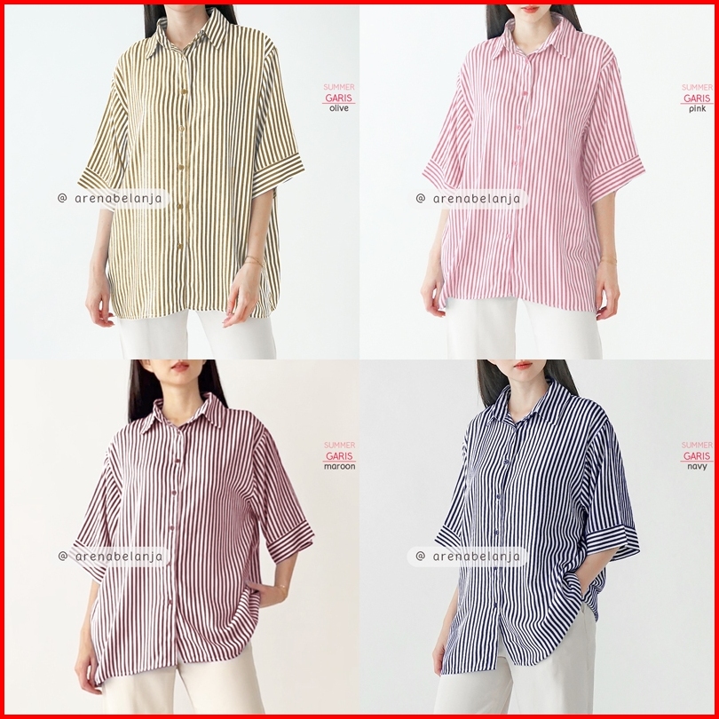 Arn - Kemeja Loose Lengan Pendek Wanita Big Size Motif Salur Polos Print Oversized Summer Shirt