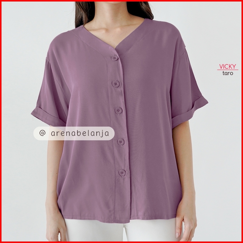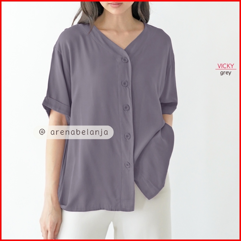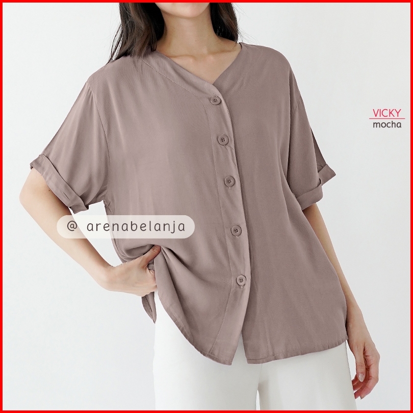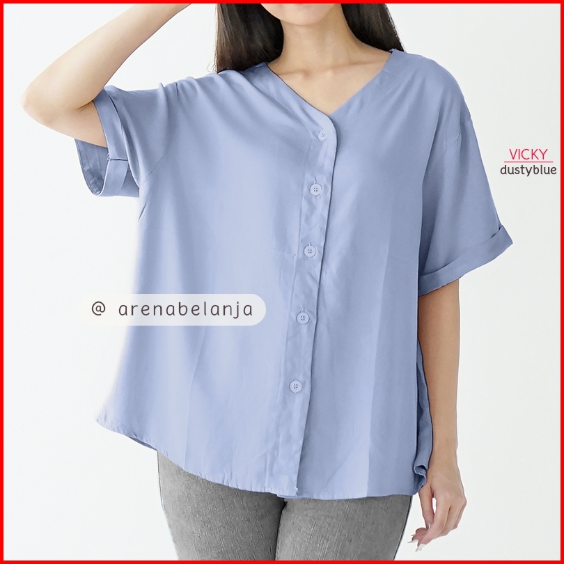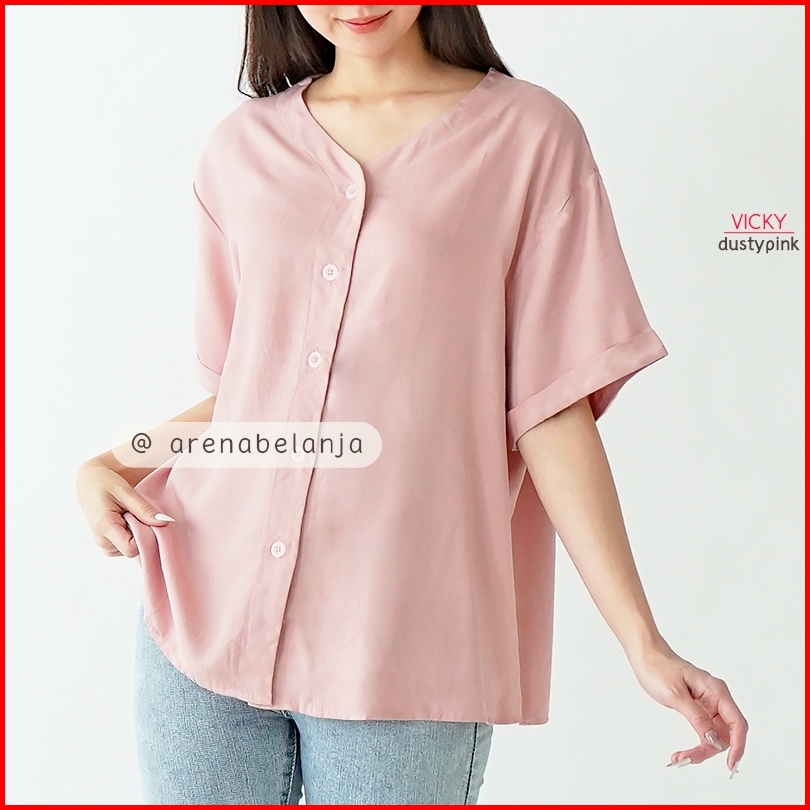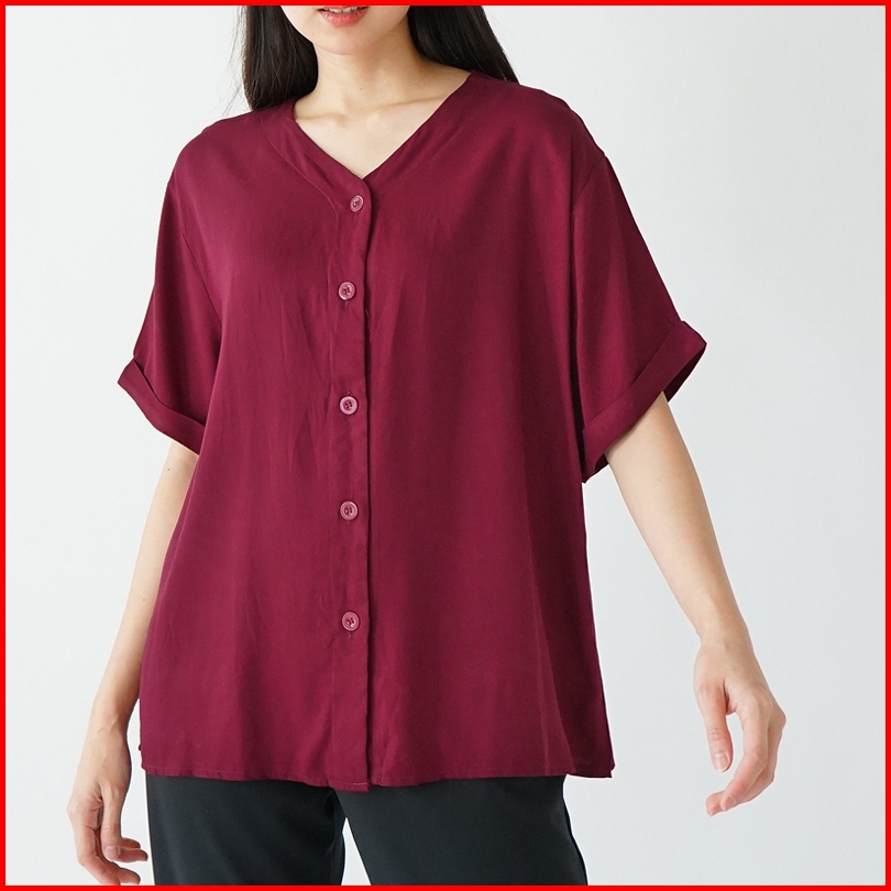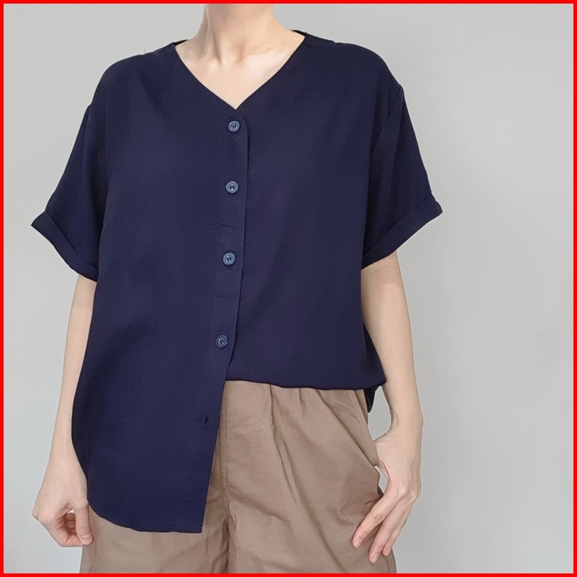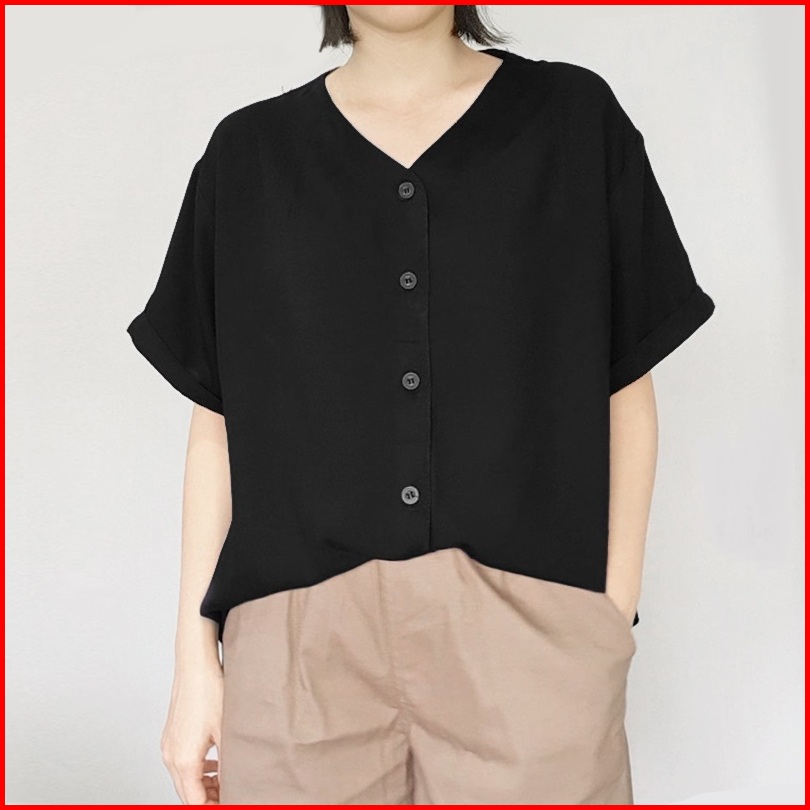 Arn - Atasan Oversize Lengan Pendek Wanita Loose Fit Blouse V Neck Kancing Depan