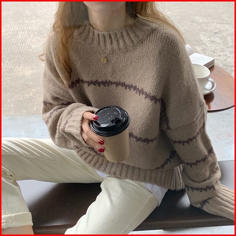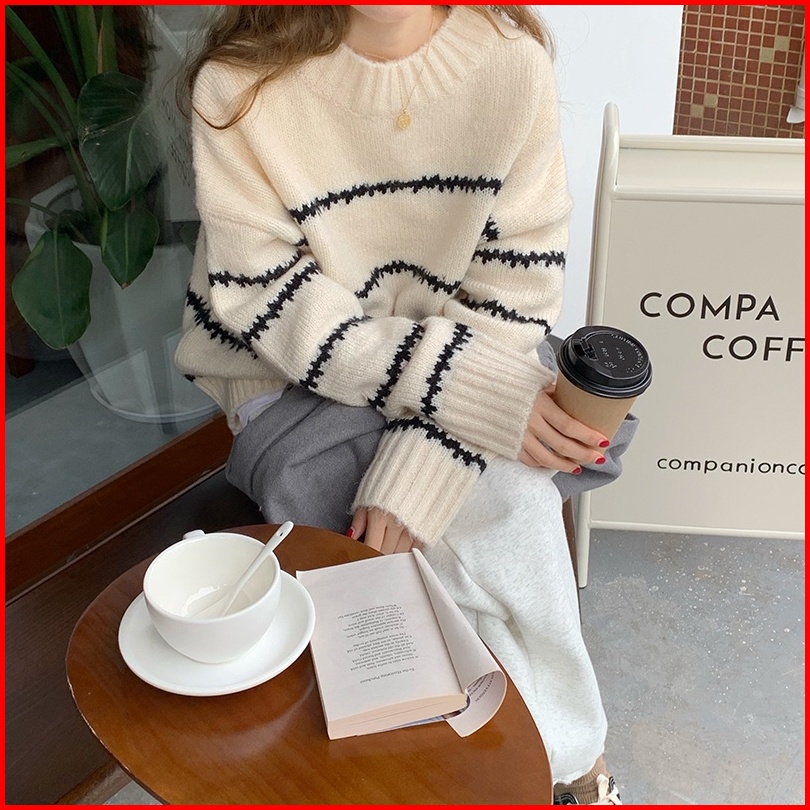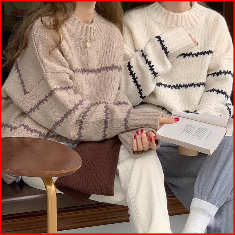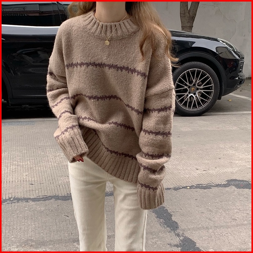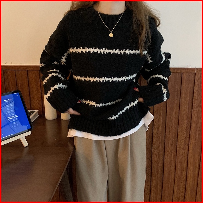 Yuruma Sweater Pullover Leher Bulat Wanita Baru Longgar Garis Korea Warna Kontras Sweater Lengan Panjang Trendi