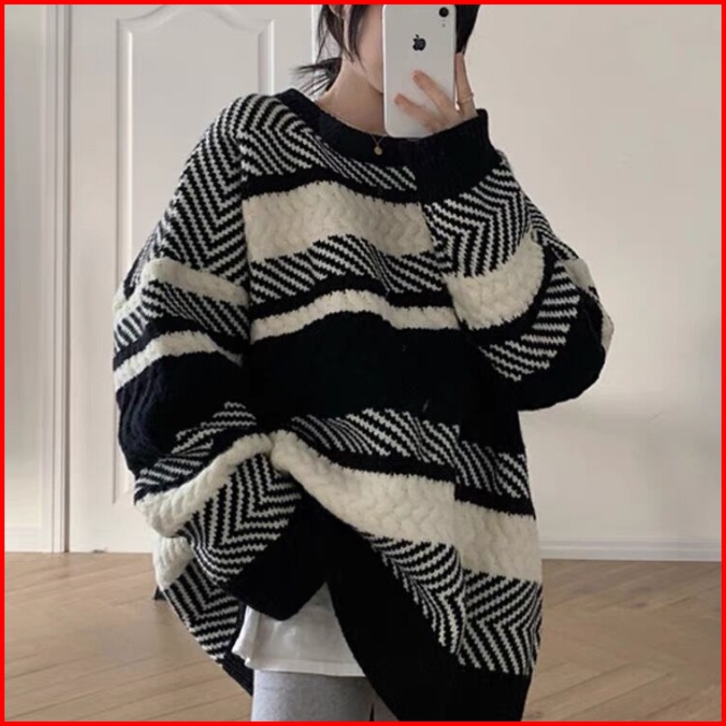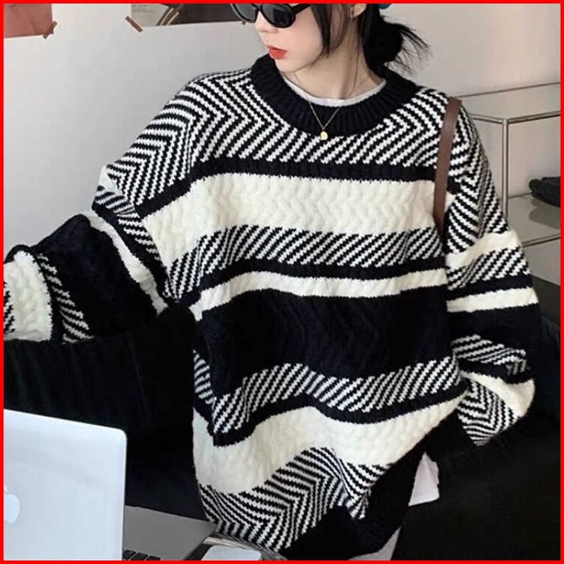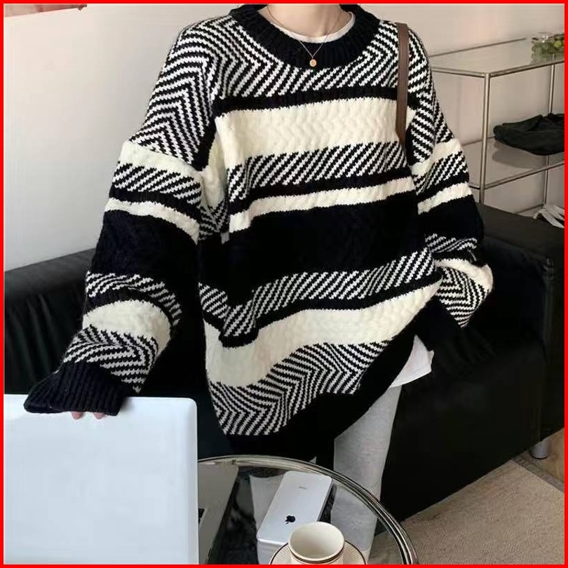 Yuruma Kontras Warna Angin Longgar Dan Malas Bergaris Jaket Sweater Rajutan Bagian Dalam Dan Luar Memakai Atasan Wanita