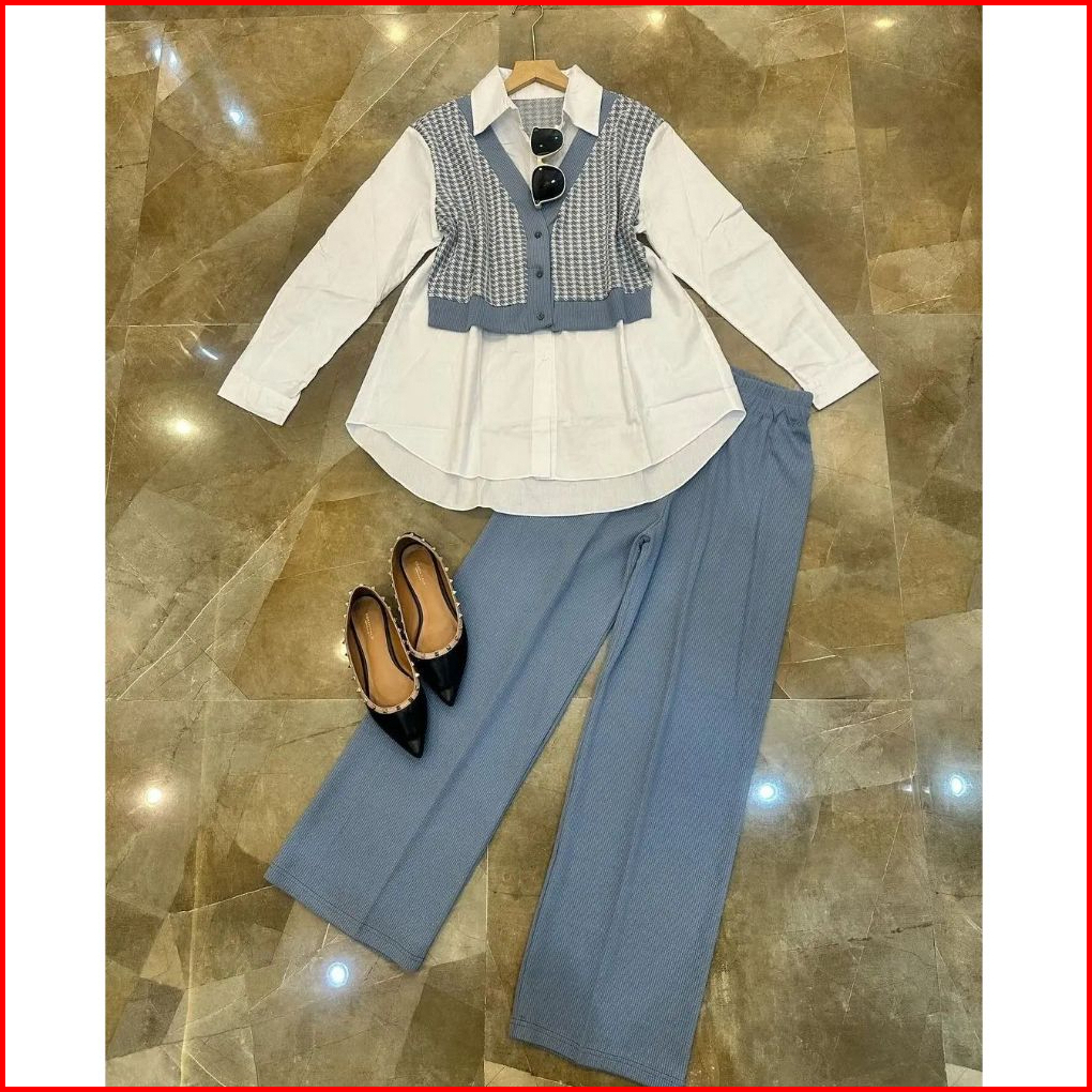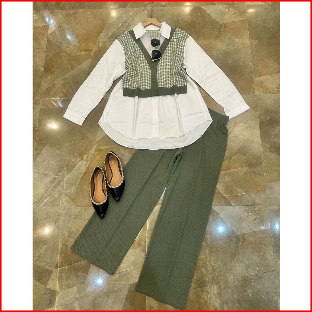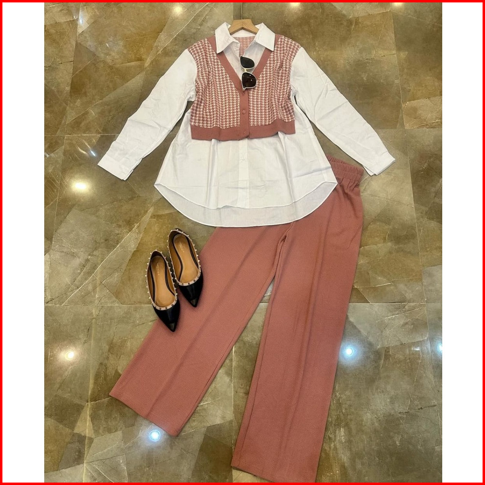 Vallina Outfit - Natallie One Set Vest Plaid Button Houndstooth Knitt Top Toyobo Baju Setelan Celana Wanita Korean Remaj