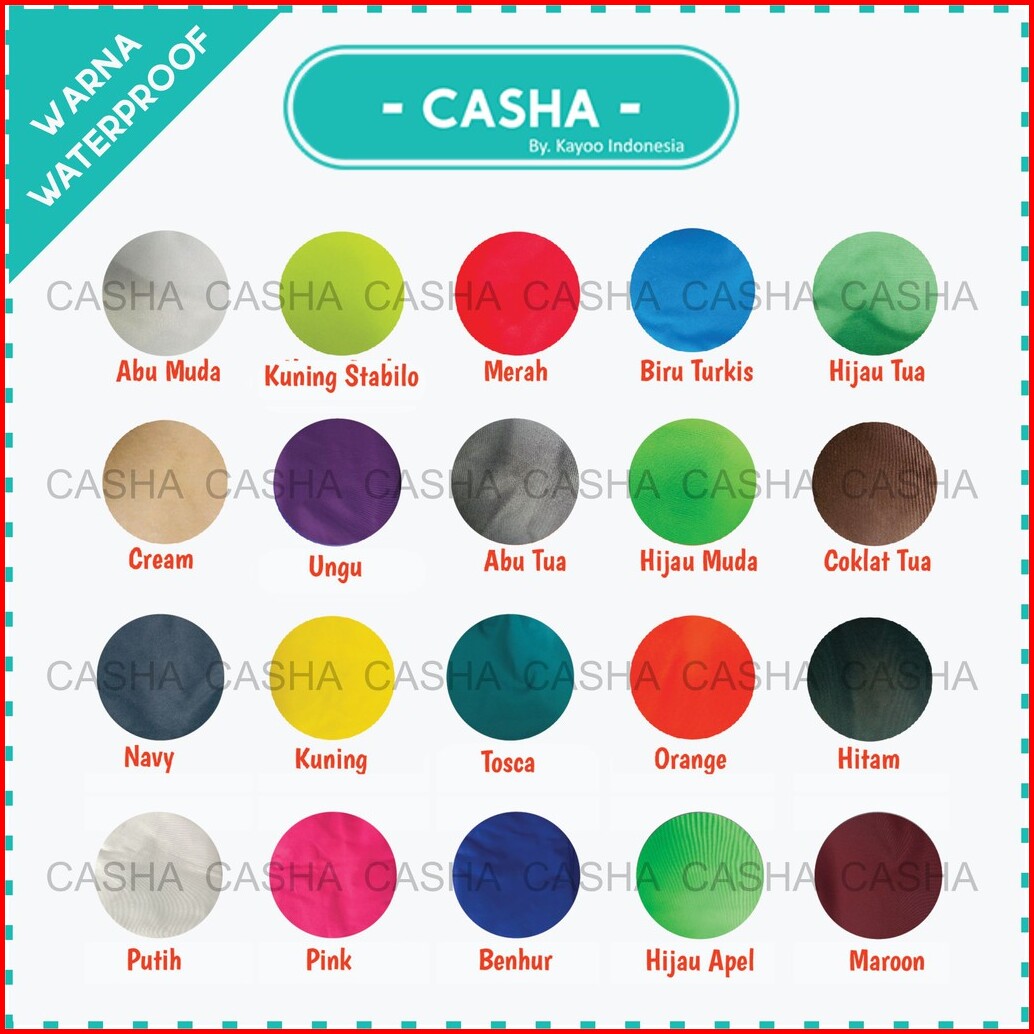 HITAM, BENHUR, TURKIS, NAVY, MERAH, MAROON, KUNING, ABU TUA, ABU MUDA, COKLAT TUA, CREAM, HIJAU TUA, HIJAU MUDA, KUNING STABILO, TOSCA, UNGU