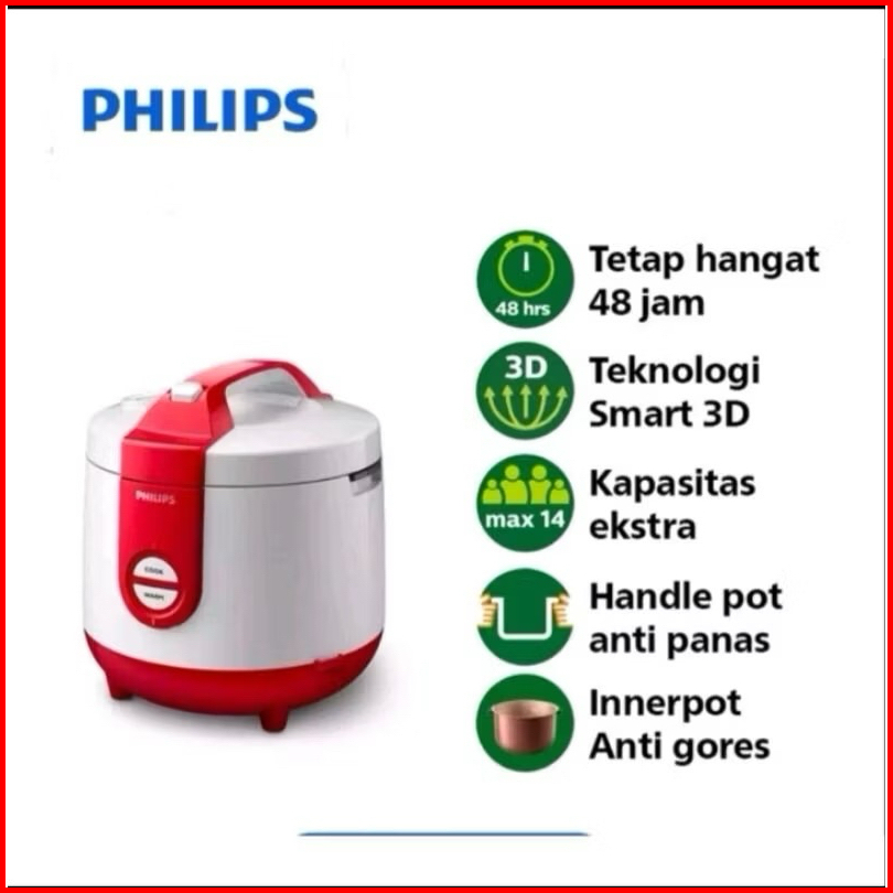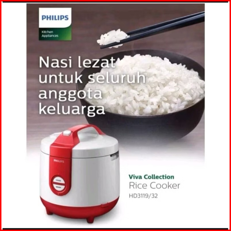 Philips 2l Rice Cooker Hd3119 32 - 400watt Penanak Nasi Analog Golden Ceramic Red Merah Mejikom M...