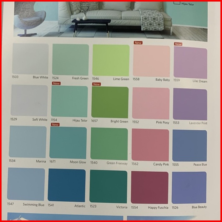 1501 EXTRA WHITE, 1503 BLUE WHITE, 1505 WHITE, 1509 LILY WHITE, 1514 DURIAN, 1515 BARLEY WHITE, 1519 BLACK, 1523 VICTORIA, 1525 JASMINE, 1526 BLUE BEAUTY, 1531 GOBY SANDS, 1534 MARINA, 1539 LAKESTONE, 1540 GREEN FREEWAY, 1541 ATLANTIC, 1546 LIME GREEN, 1547 SWIMMING BLUE, 1548 STONE GREY, 1549 COPPER GREY, 1550 GRAY CLOTH, 1552 PINK ROSSY, 1553 LAVENDER PRINT, 1554 HAPPY FUSCHIA, 1555 PEACE BLUE, 1556 CAFE LATTE, 1557 SUNSHINE, 1562 CANDY PINK, 1117 IVORY, 1131 ORANGE TORCH, 1657 BRIGHT GREEN, 1671 MOON GLOW, 1154 HIJAU TELOR