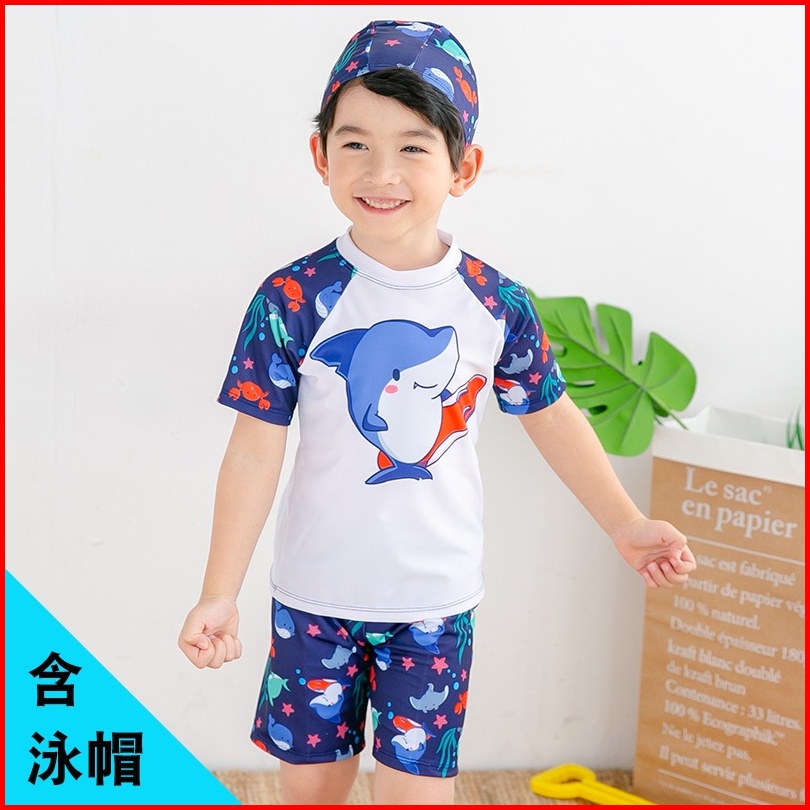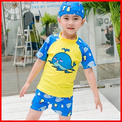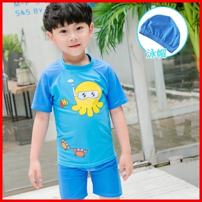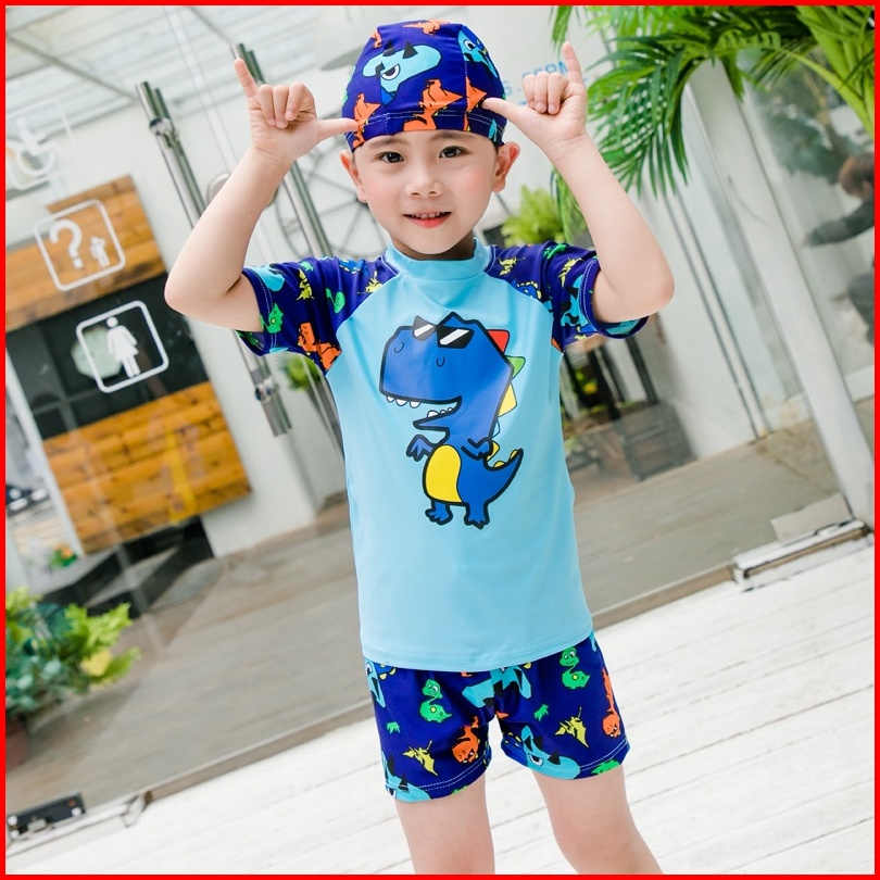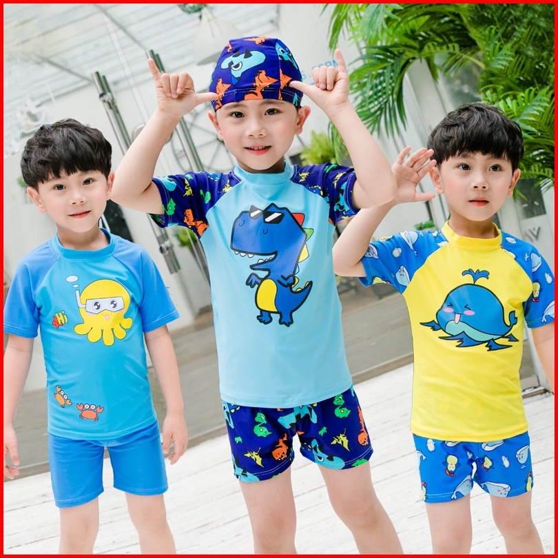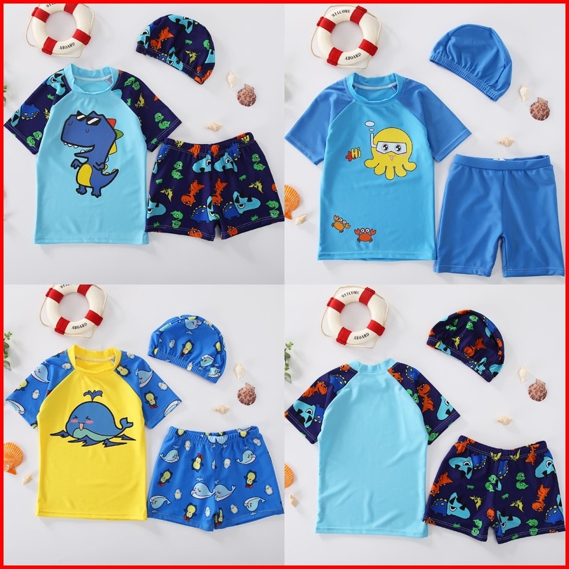 New Set Baju Renang Anak Laki-laki Dan Topi Renang Blue Swimsuit Premium Quality