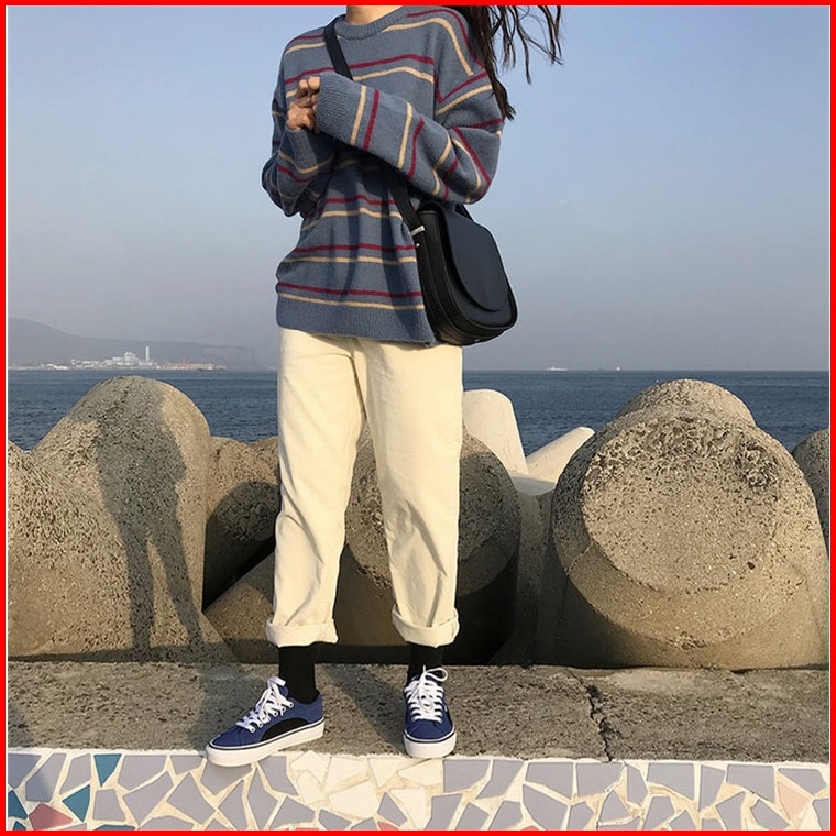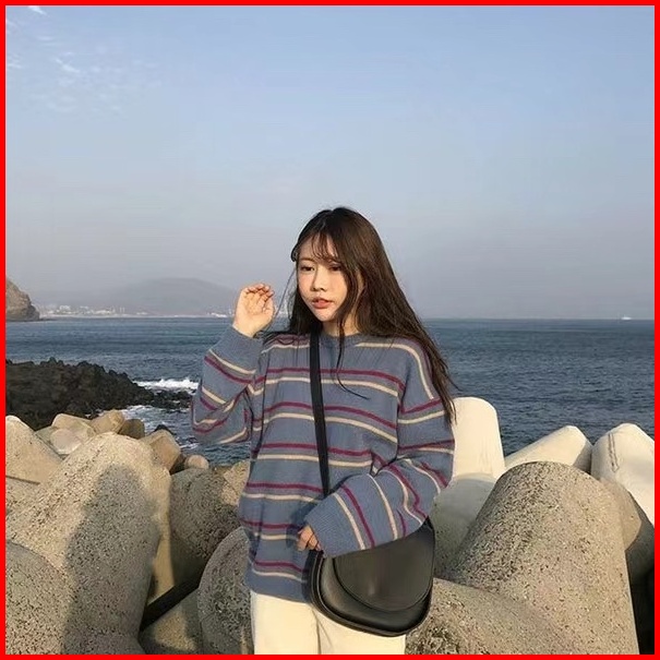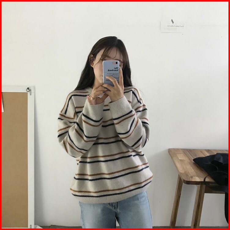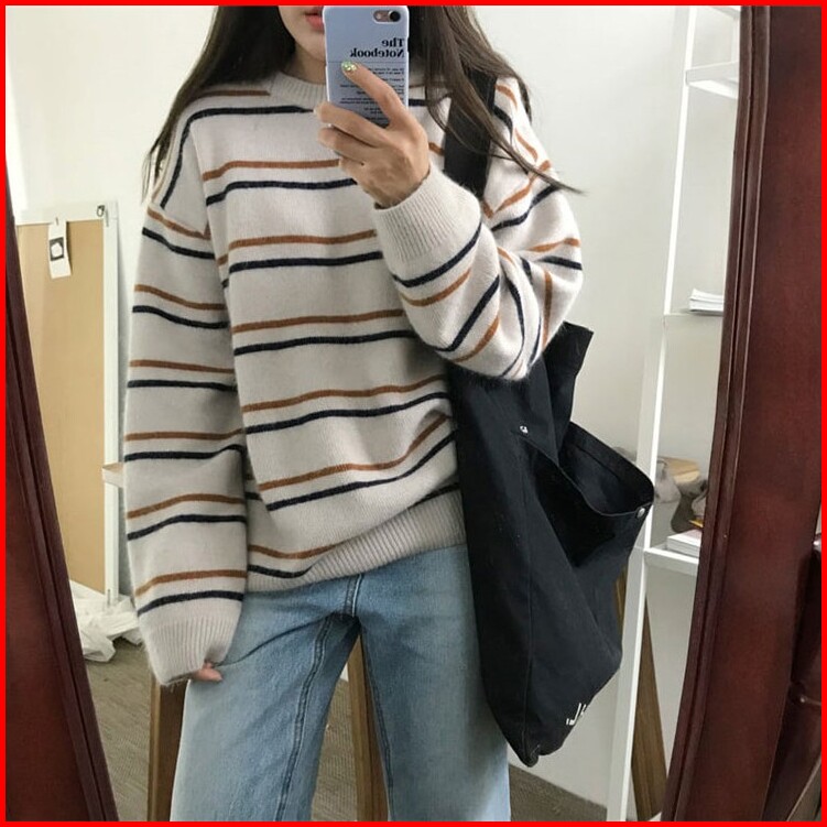 Sweater Model Round Neck Lengan Panjang Motif Garis Untuk Wanita