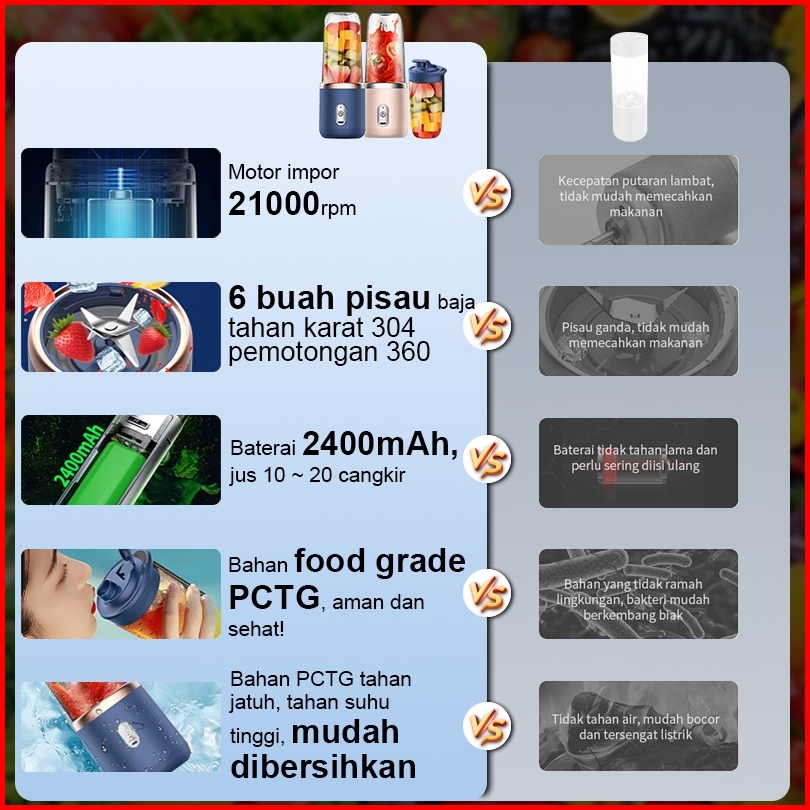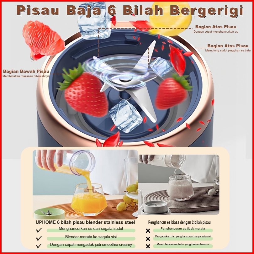 Uphome Mini Juice Blender 6 Pisau 400ml Blender Portable Usb Pembuat Jus Elektrik Rechargeable Mini Mixer Ice Crusher