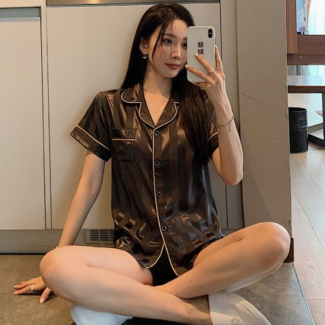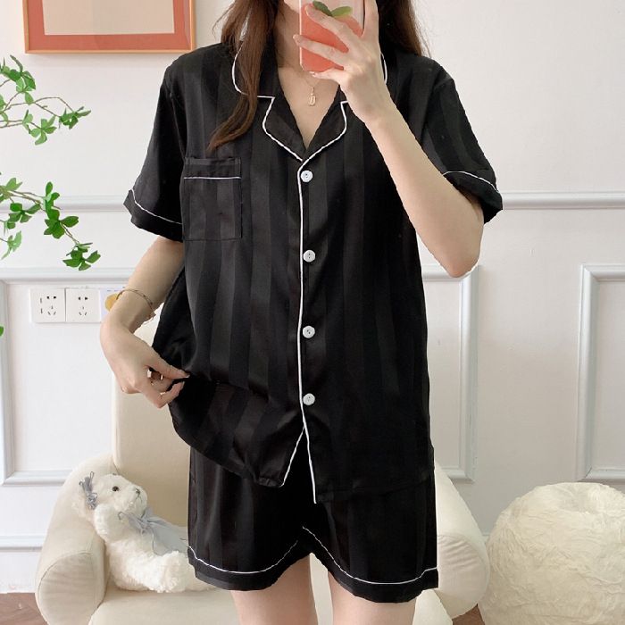 2023 garis-garis vertikal baru sutra es sutra piyama wanita baju pendek lengan pendek setelan pakaian rumah