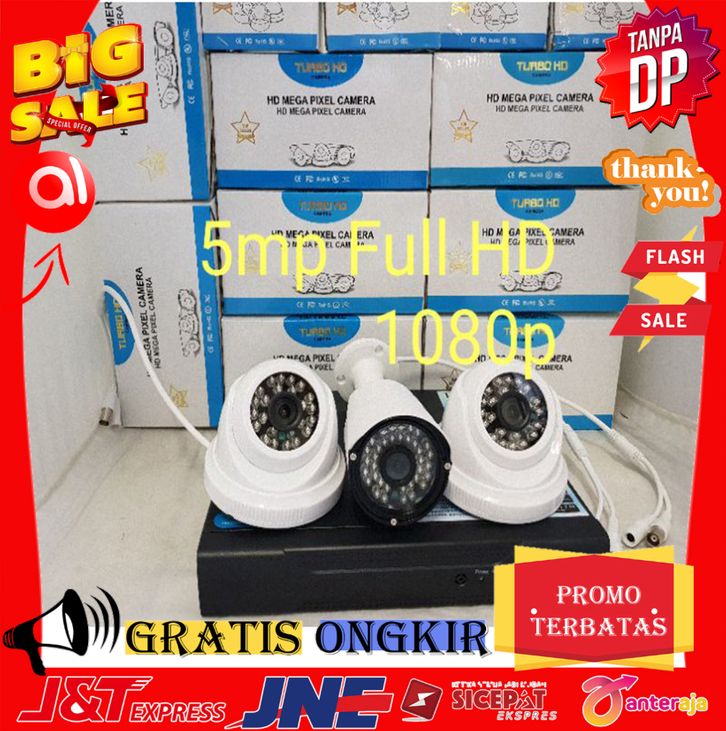 ASLI PAKET CCTV 5MP FULL HD 4CH 3 CAMERA ( LENGKAP TINGGAL PASANG )MURAH GARANSI