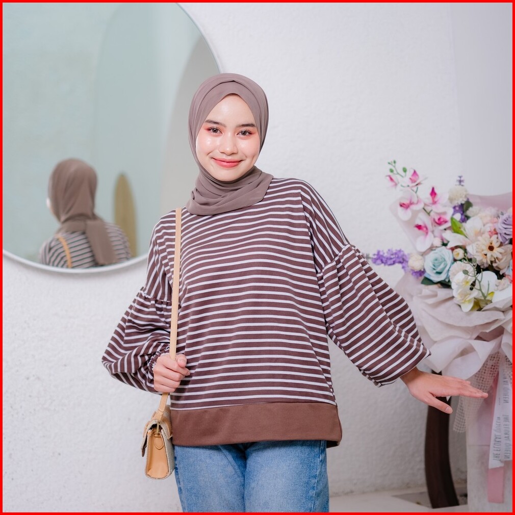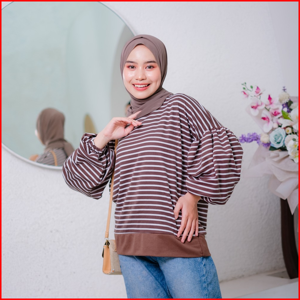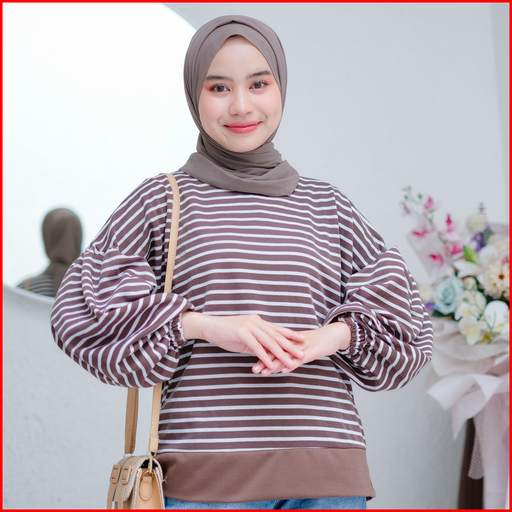 Mybamus Balloon Stripe Wrinkle Tops Mocca M15315 R51s5