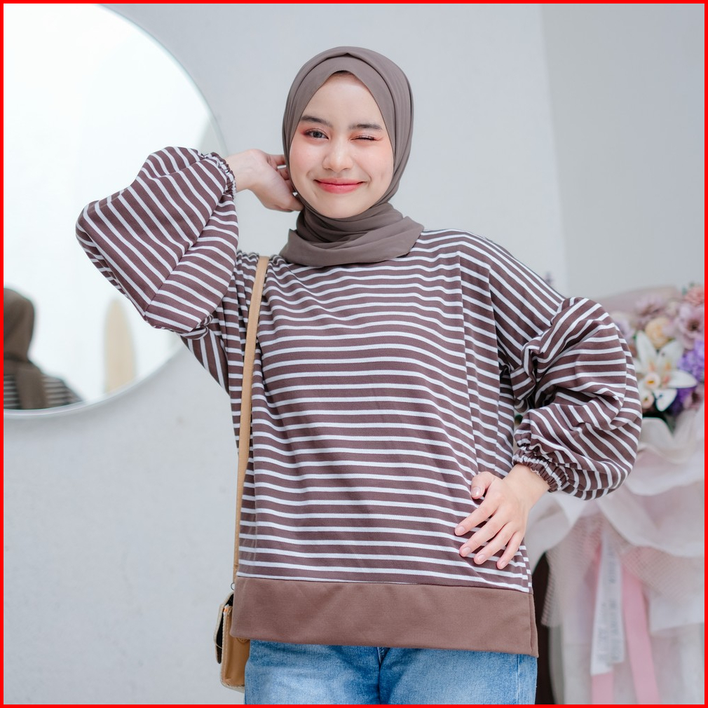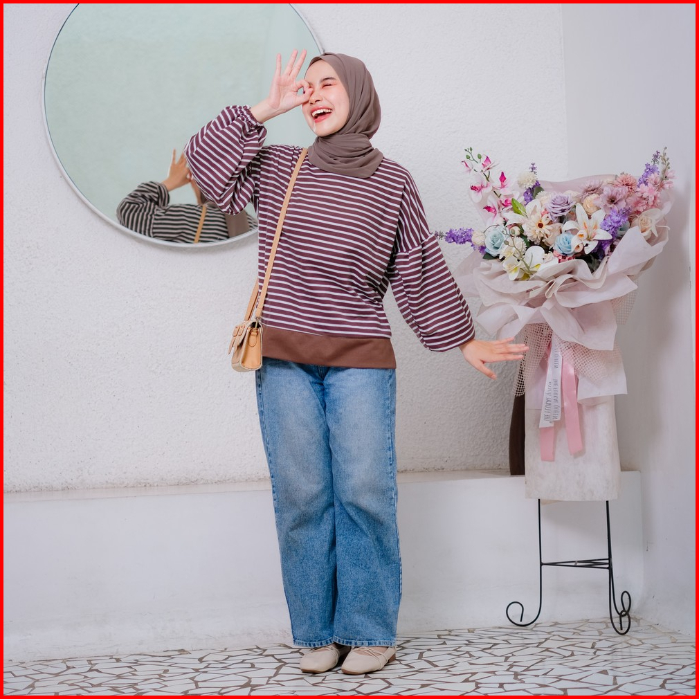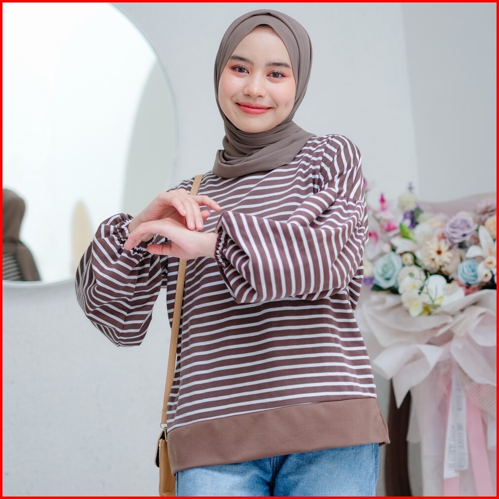 Mybamus Balloon Stripe Wrinkle Tops Mocca M15315 R51s5