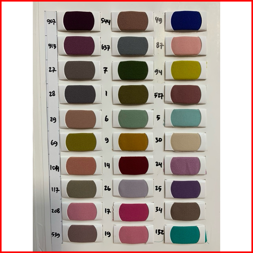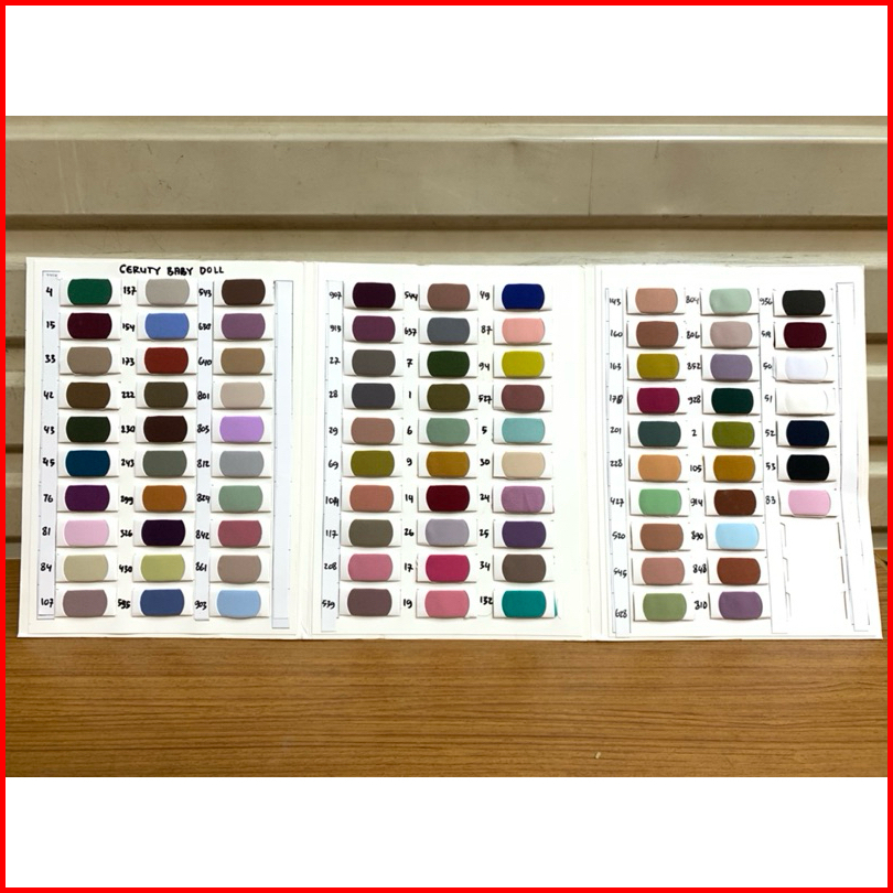 Hitam, Putih bw, Hijau min Sage, Dusty pink, lemon, Denim, Coksu, Milo, Ungu lilak, Kuning kunyit, Putih bersih, Army, Abu tua, Silver, Hijau botol muda, Oliv, Nevi, Army tua, Marun, Keramel, Ping baby, Pink salam, Teracota, Biru Wardah, Oren, Sage tua, Rasbery, Merah cabe, Lavender tua, Dasty purple, Ungu lilak muda, Moka, Biru elektrik, Coklat tua, Hijau lemon muda, Peahc muda, Denim tua, Pemda, ijo wardah, Salem, Abu sedang, Ungu Lavender, Kuning Golkar, Abu semen, Coksu muda, Hijau fuji, Hijau pucuk, Baby blue, Fanta, Merah hati, Army gelap, Kuning lemon, Kuning, Hijau botol tua, Lilak muda, Min, Krem