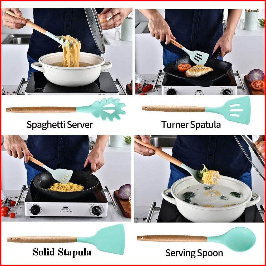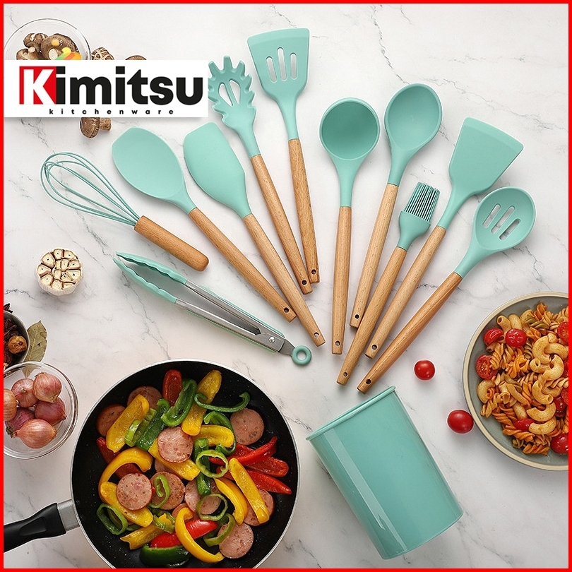 Kimitsu Silicone Utensil 11pcs Wadah Spatula Peralatan Masak Sutil Pegangan Kayu Baking Set Alat Masak Silikon