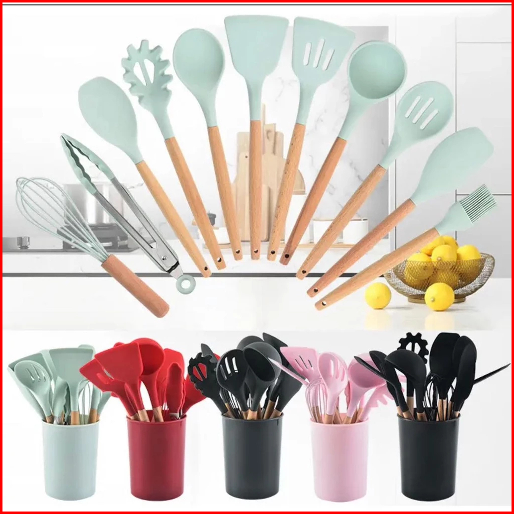 Spatula Silicone Peralatan Masak Utensil 11pcs Wadah Sutil Pegangan Kayu Baking Set Alat Masak