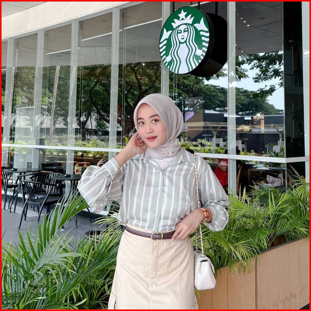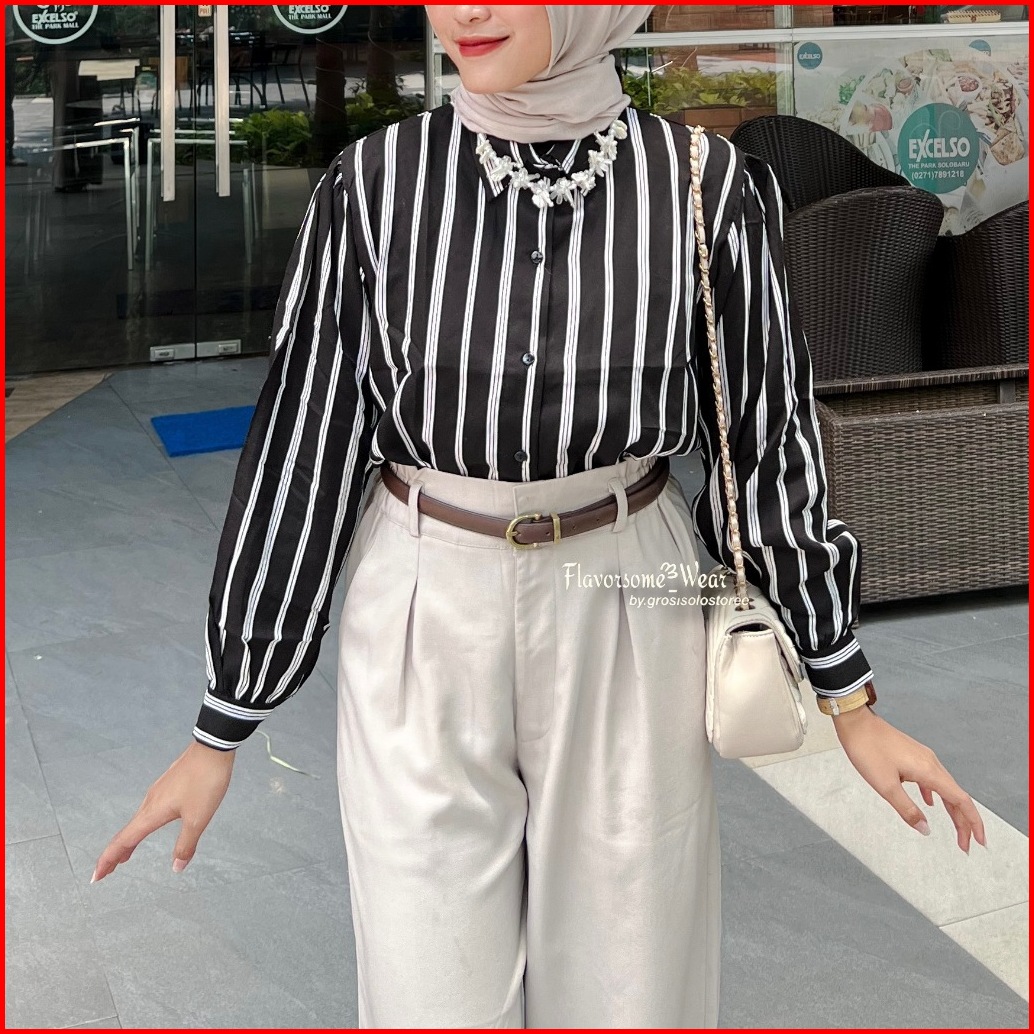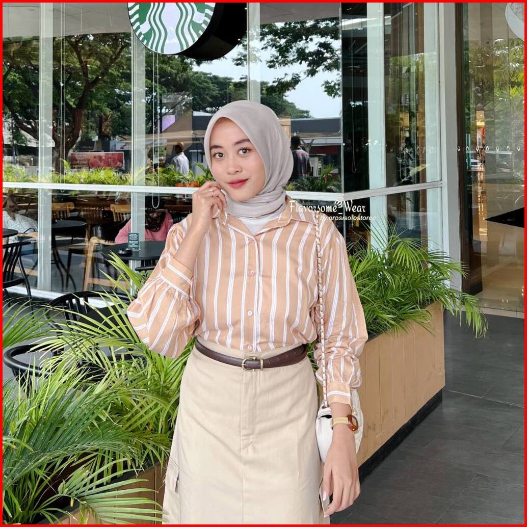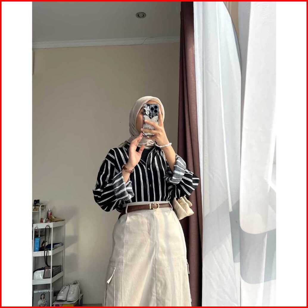 Kemeja Setrip Salur Wanita Rayon Oversize Lengan Panjang Adista