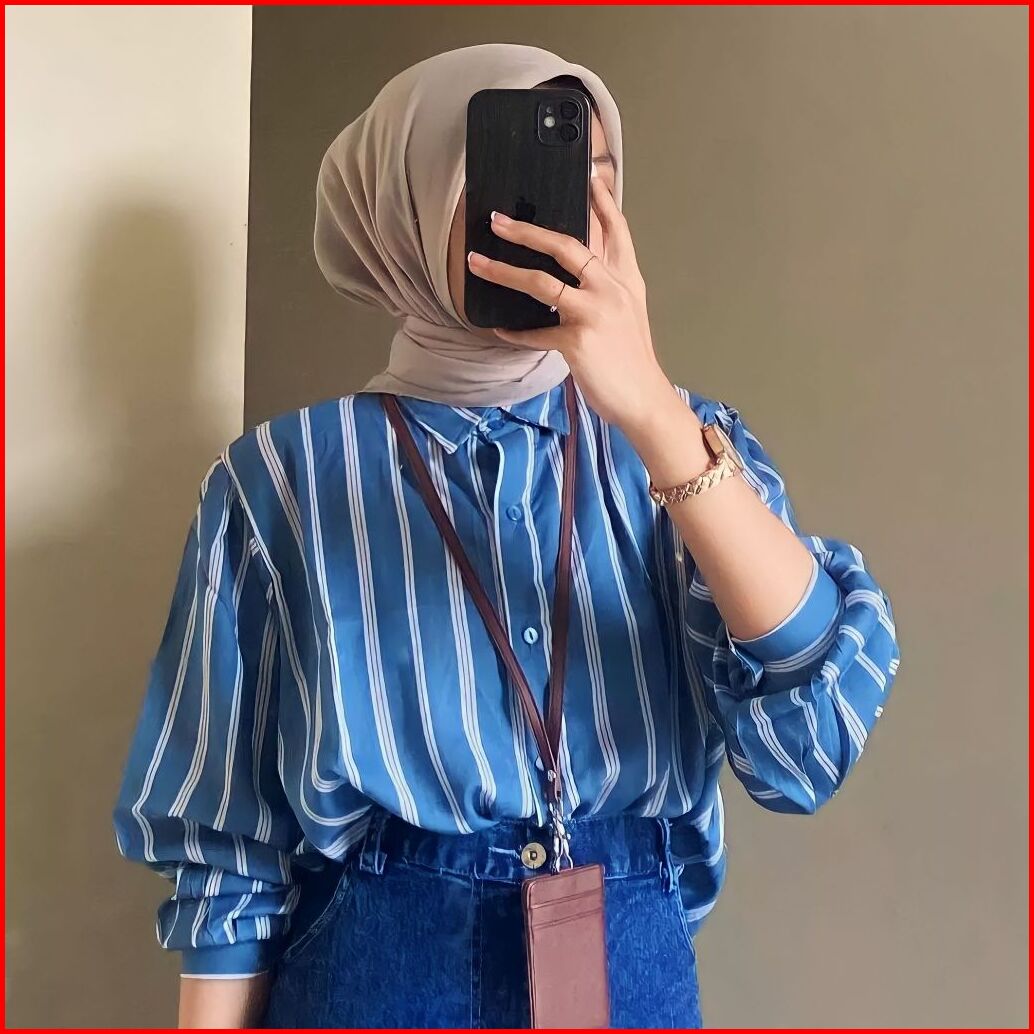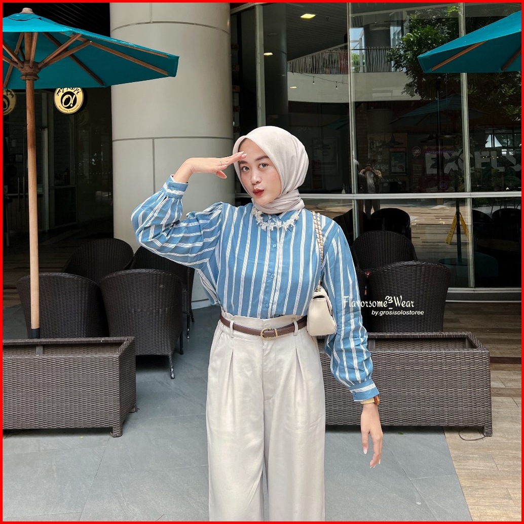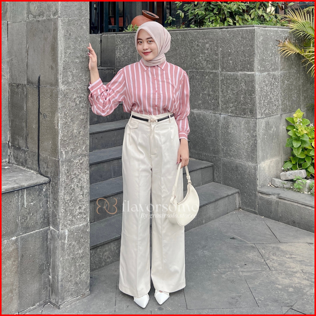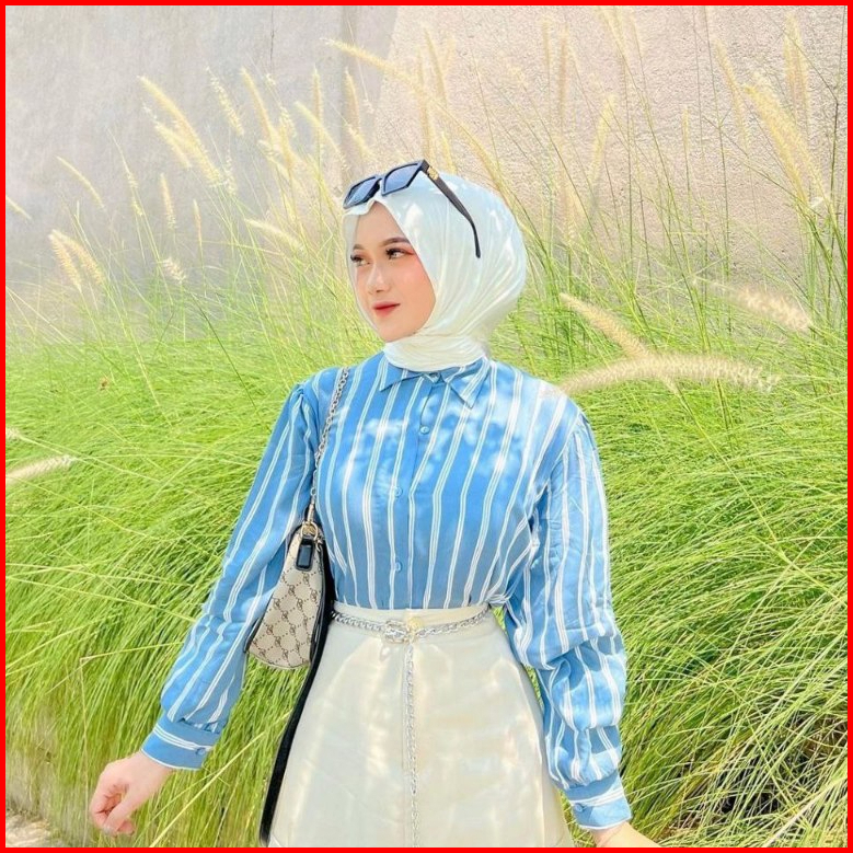 Kemeja Setrip Salur Wanita Rayon Oversize Lengan Panjang Adista