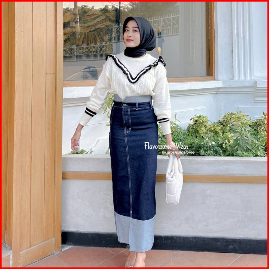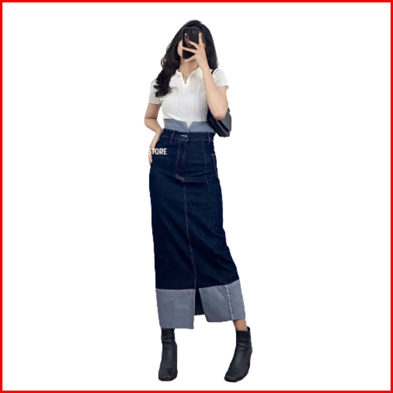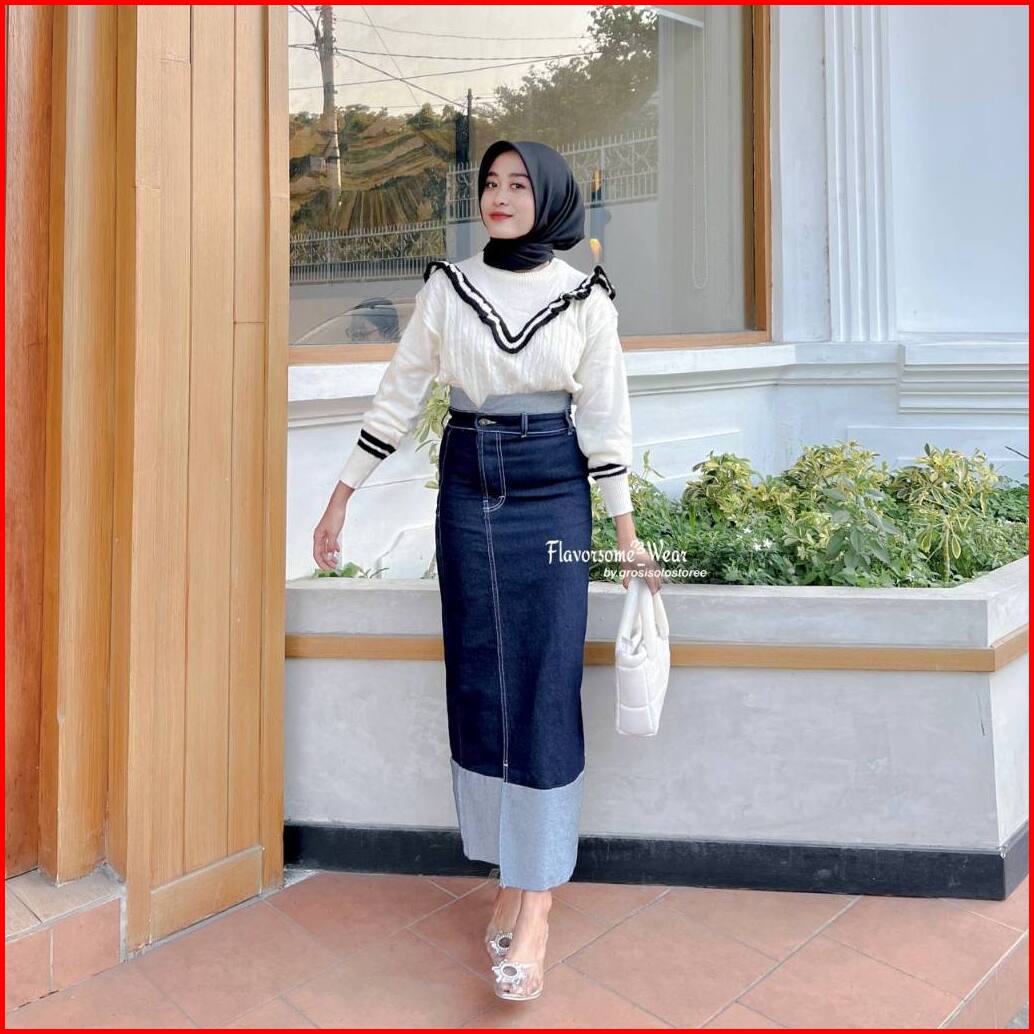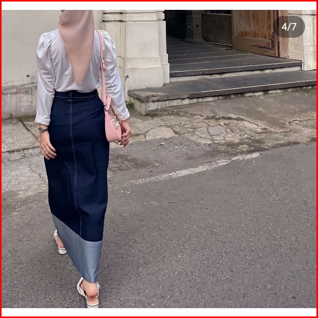 Two Tone Rok Skrit Jeans Highwaist Wanita Streach