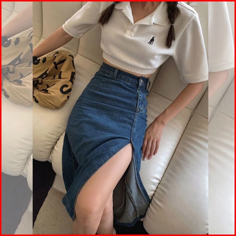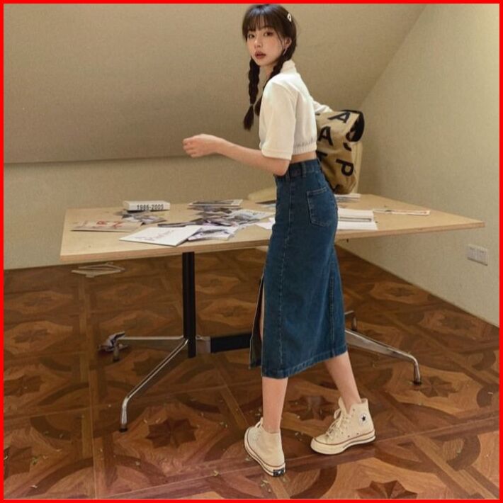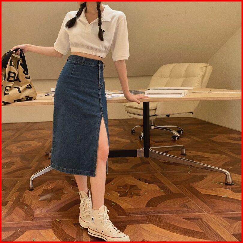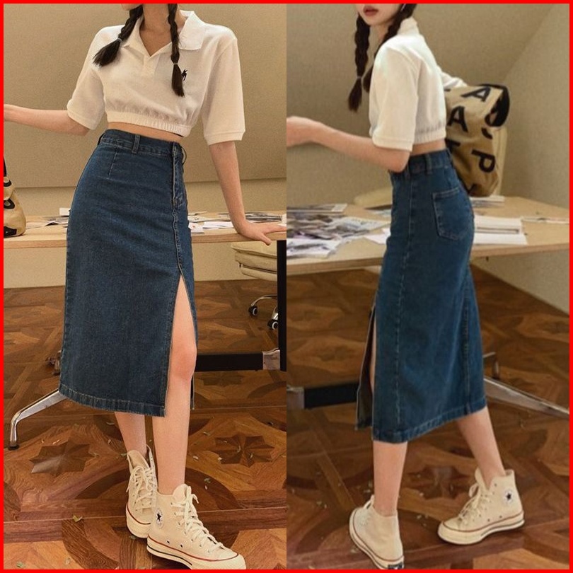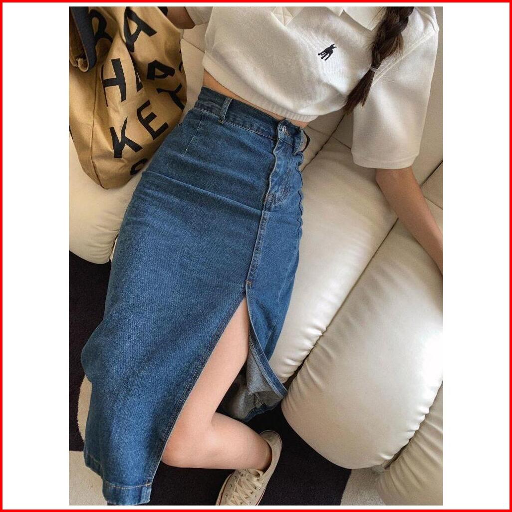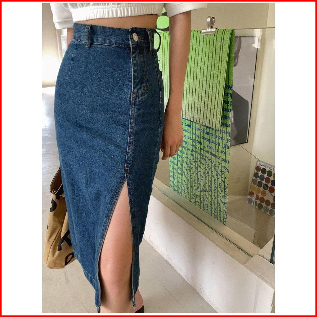 Rok Jeans Korean Style Wanita Rok Span Jeans Panjang Belahan Korean Style High Waist Wanita Rok Denim Yang Menutupi Mid-