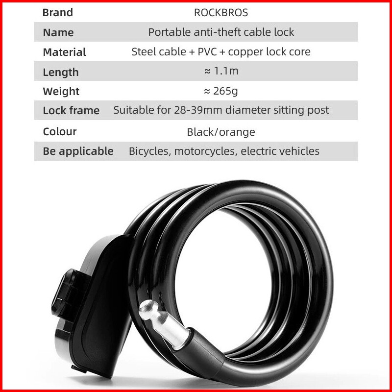 Rockbros Rks515 Kunci Gembok Sepeda Lock Ring 110 Cm Portable Cable Lock Pengaman Motor Sepeda Helm