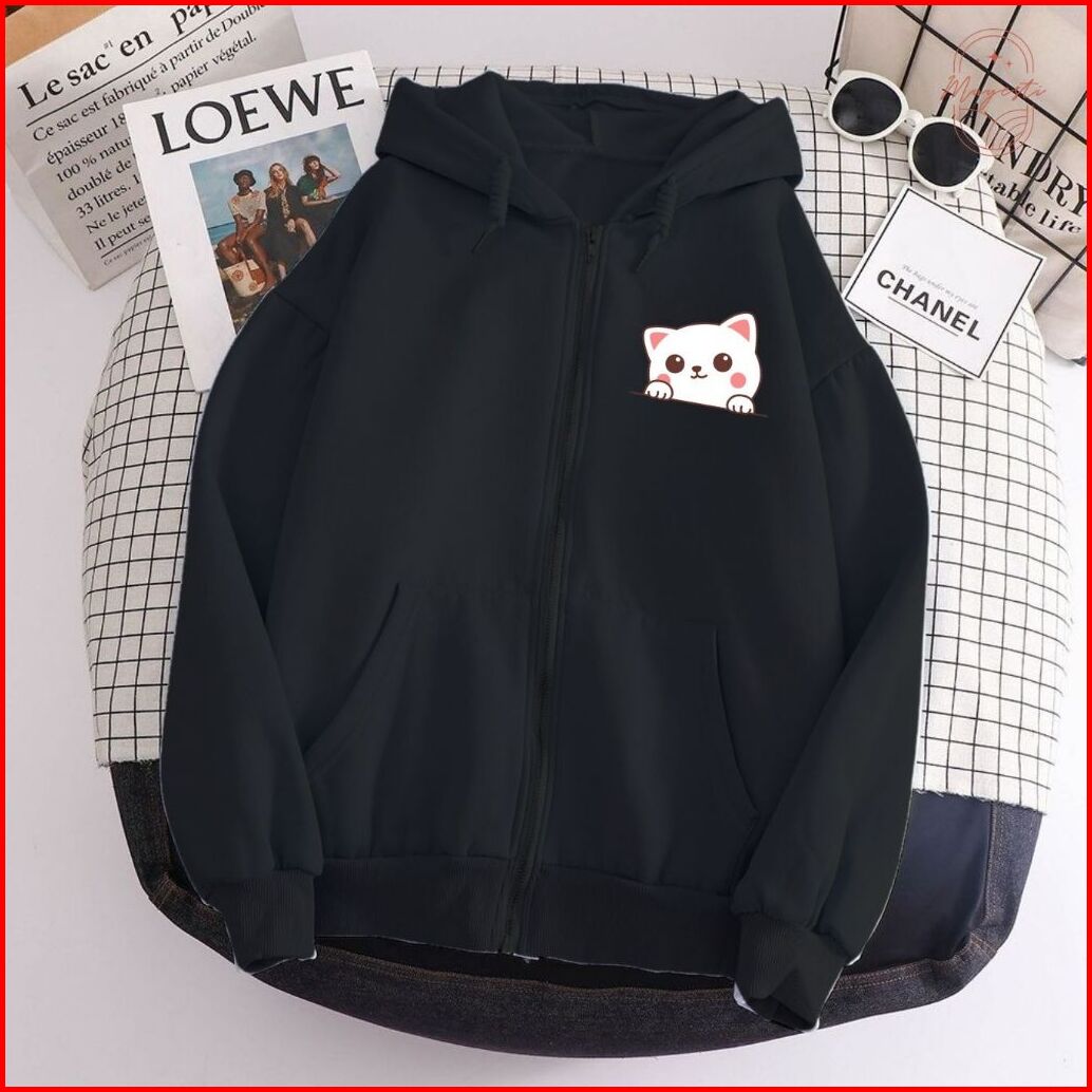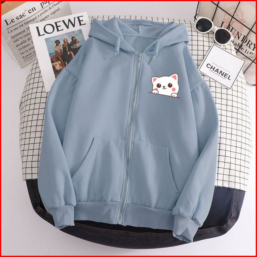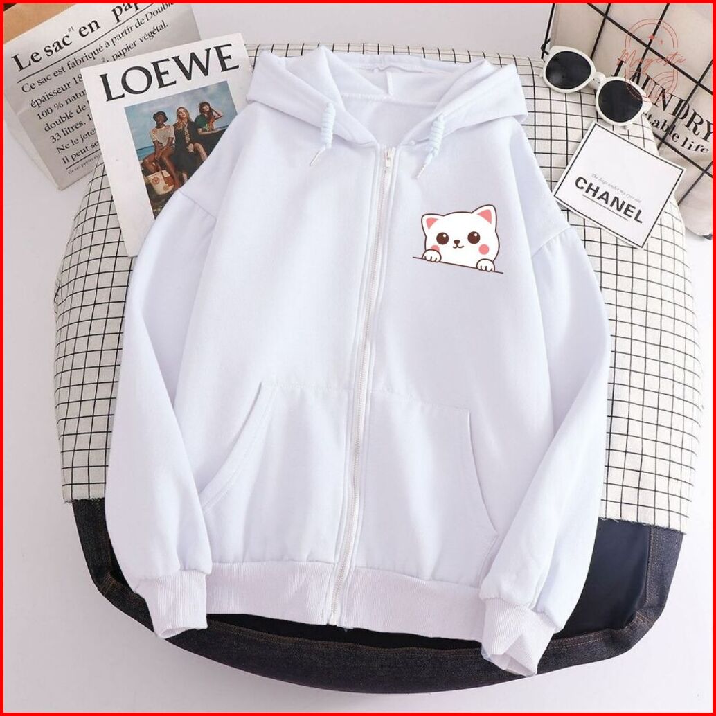 Jaket Hoodie Resleting Zipper Cewek White Cat Lucu Viral L Xl Xxl Aestetik Baru