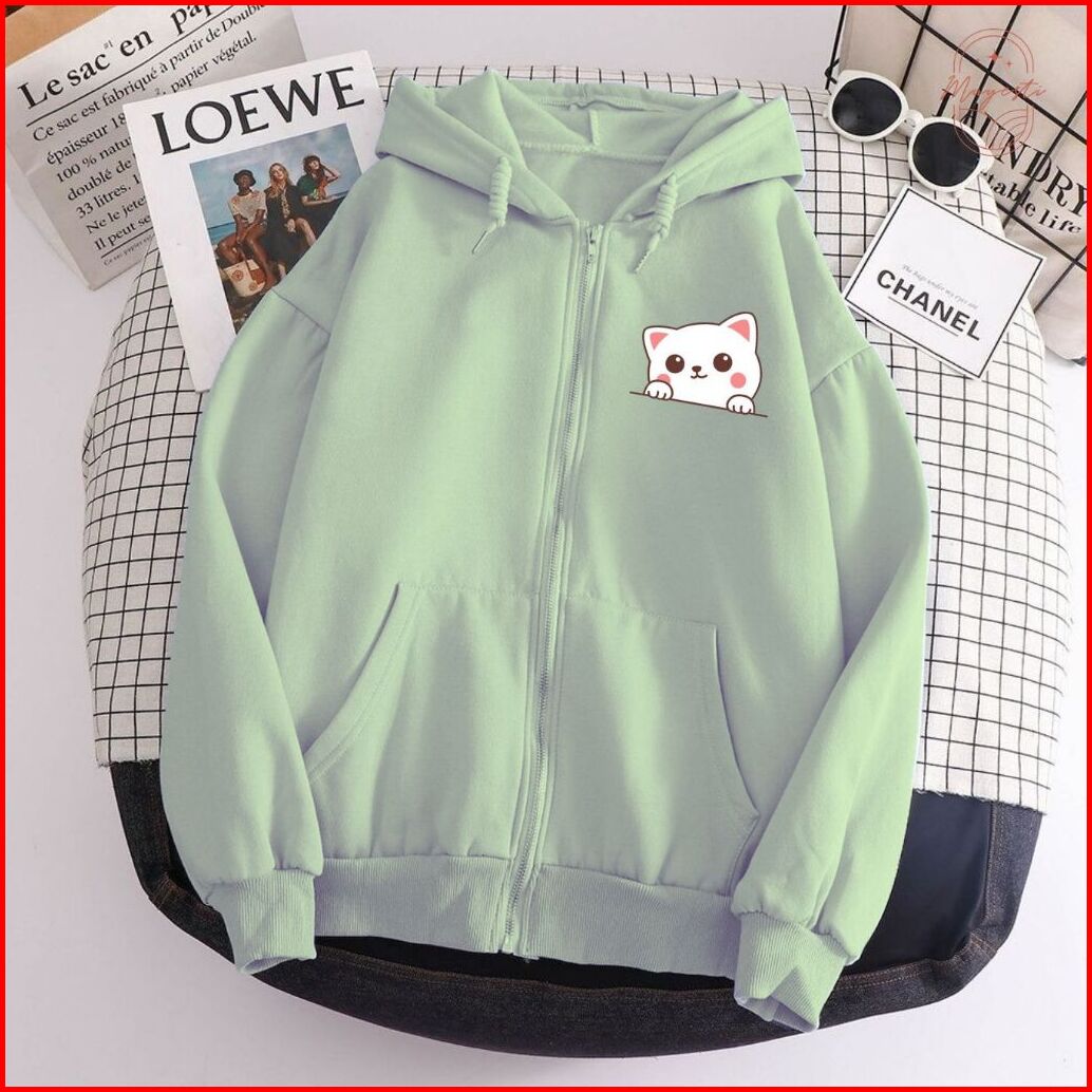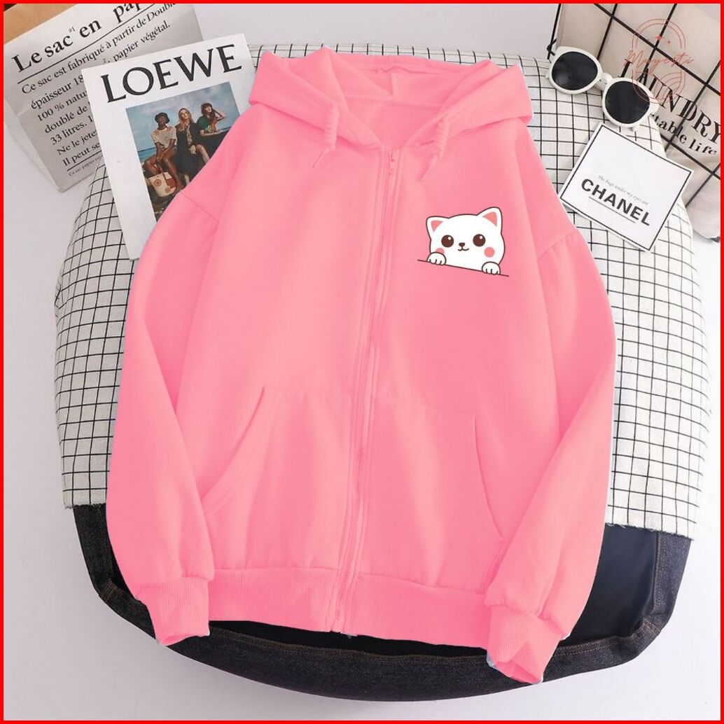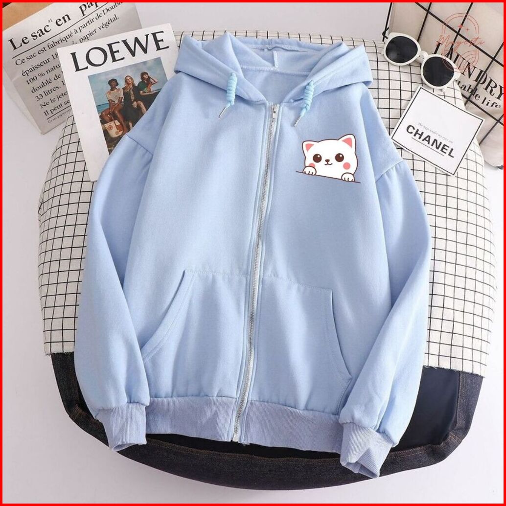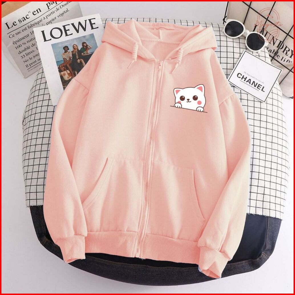 Jaket Hoodie Resleting Zipper Cewek White Cat Lucu Viral L Xl Xxl Aestetik Baru