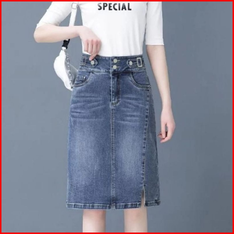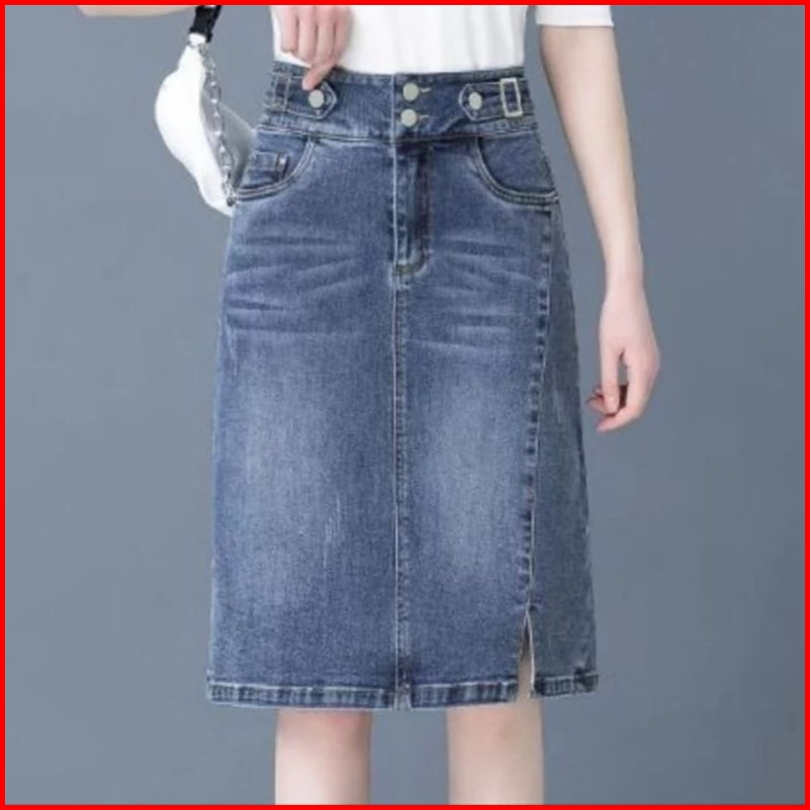 Rok Jeans Stretch Pendek Belah Samping Pinggang Karet M-l-xl