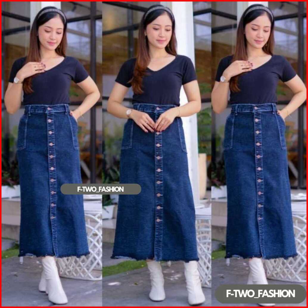 Rok Jeans Streech Span Panjang Gisca Kancing Depan Tebal Melar