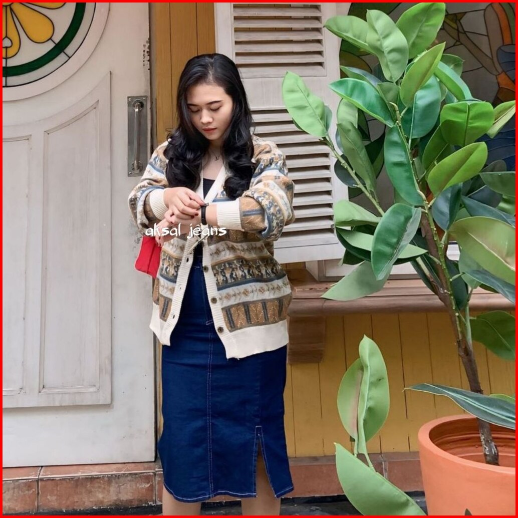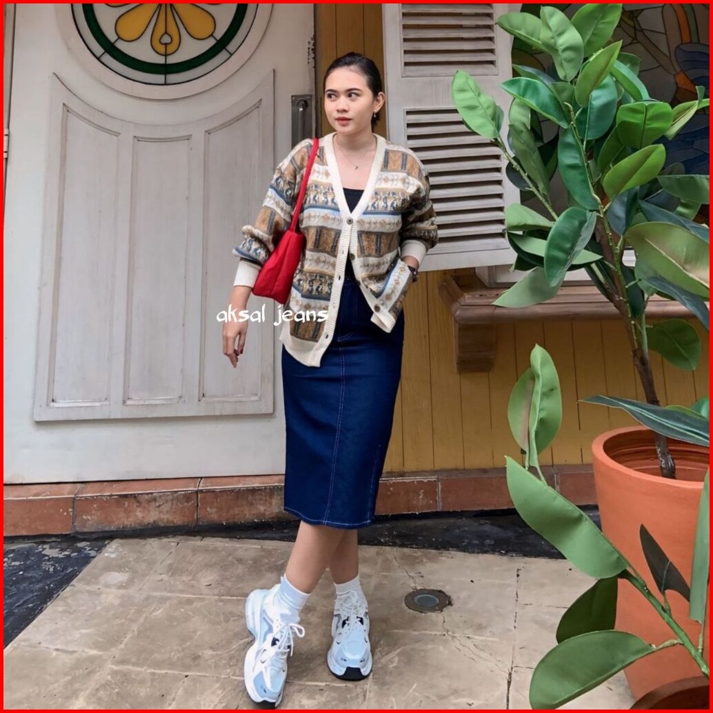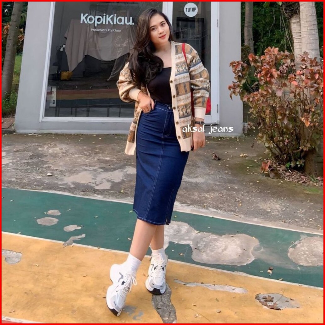 Rok Jeans Higwaist A-line Panjang 7 8 Belah Samping Pinggang Karet Korean Style Terbaru Aksal Jeans